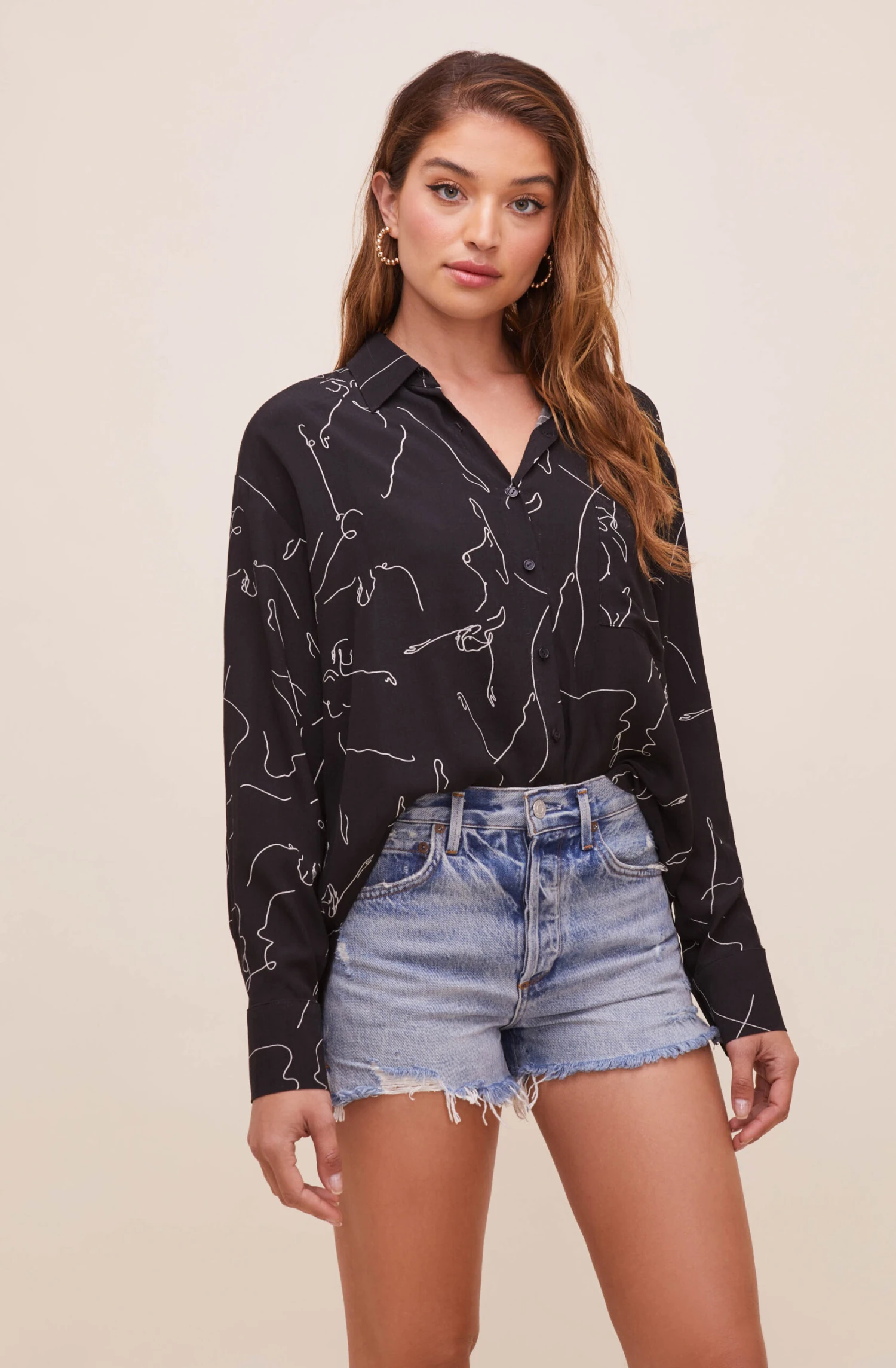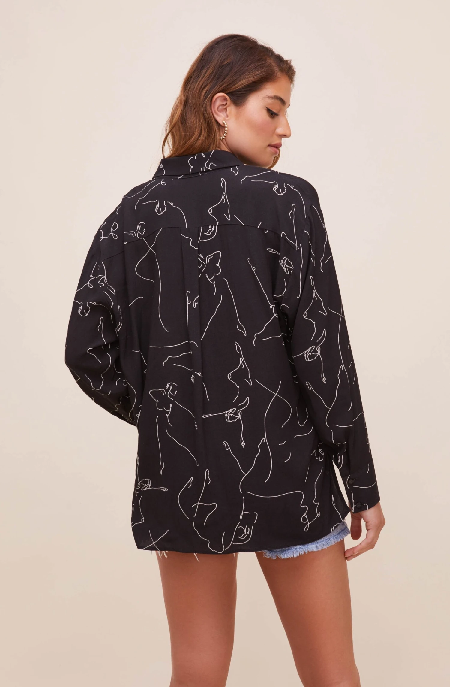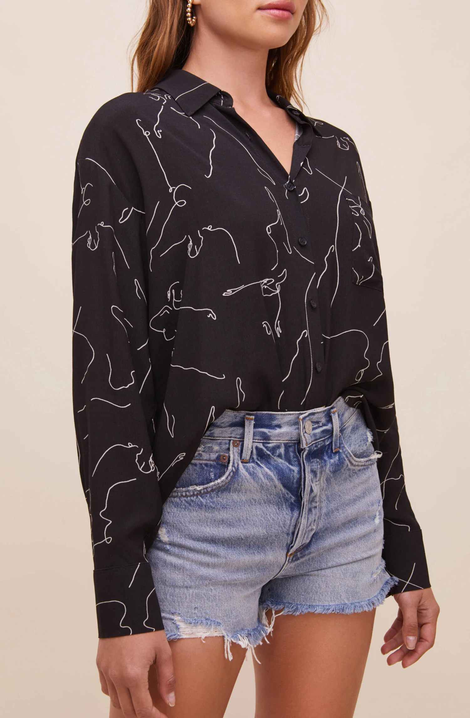 Elevate your daily ensemble with a sleek blouse. Pointed collar leads down to a front button placket and hi-lo hemline. Decorated with an abstract ballet dancer print for an element of chic. Long sleeves with buttoned cuffs and front patch pocket accent.