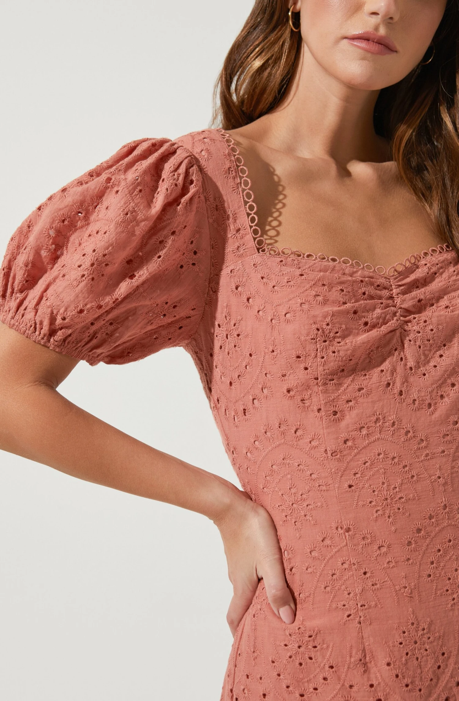 The Alba Dress features a sweetheart neckline and short puff sleeves. Lace design features a sweet-yet-subtle scallop-edge trim throughout. Fitted bodice leads to an abbreviated hemline with a tiered, scalloped hemline. Square-cut back with tying accent.