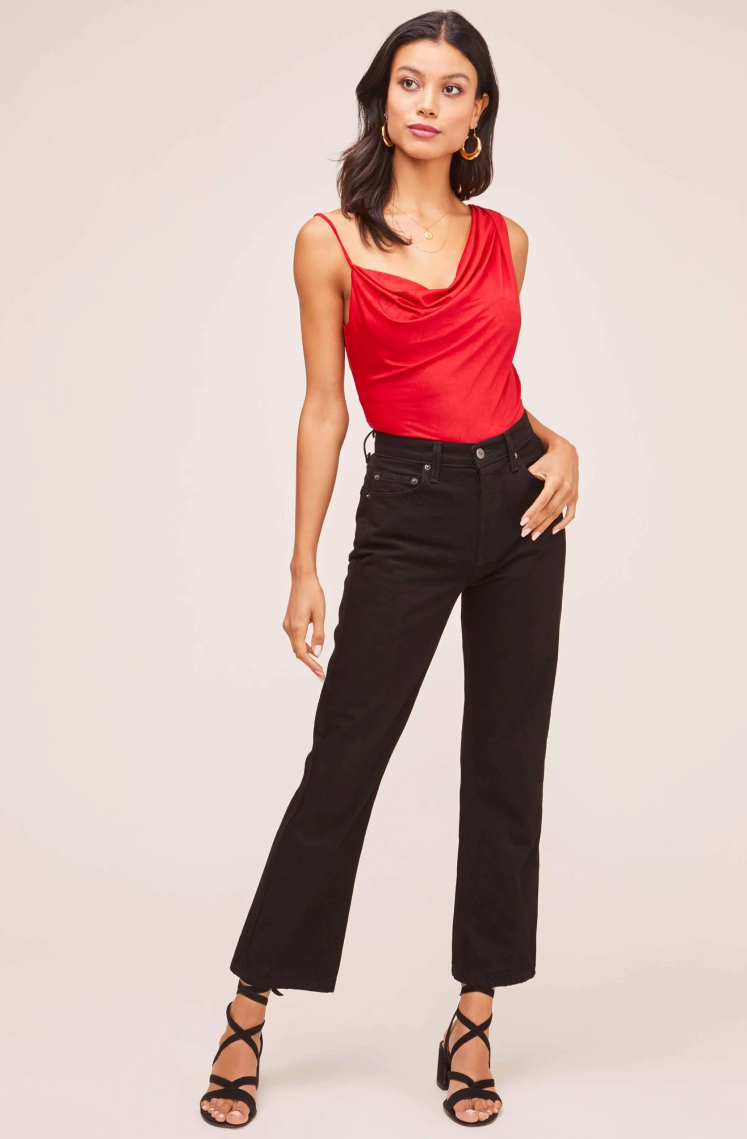 A red-hot bodysuit for fiery moments. Asymmetrical straps support a flattering cowl neckline that descends to a fitted bodice. Low-cut back drapes perfectly for the perfect dose of sexy.