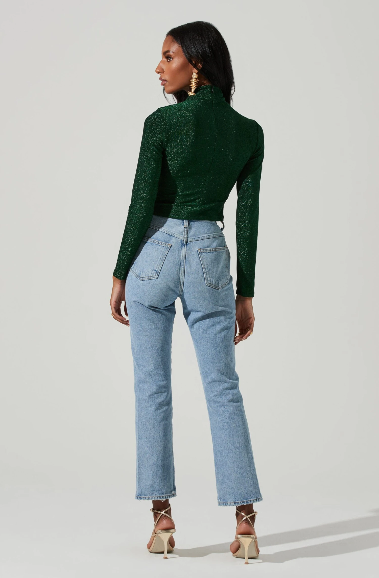 The Crane Top features a metallic finish. Twist neckline leads to a front cutout accent. Long sleeves.