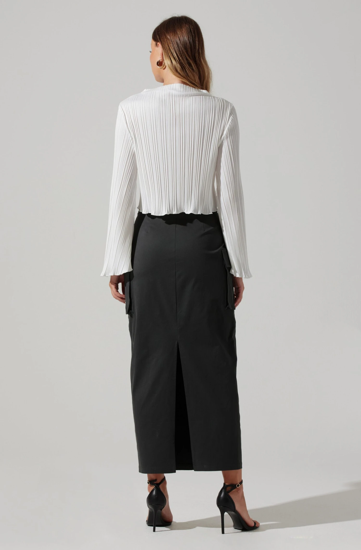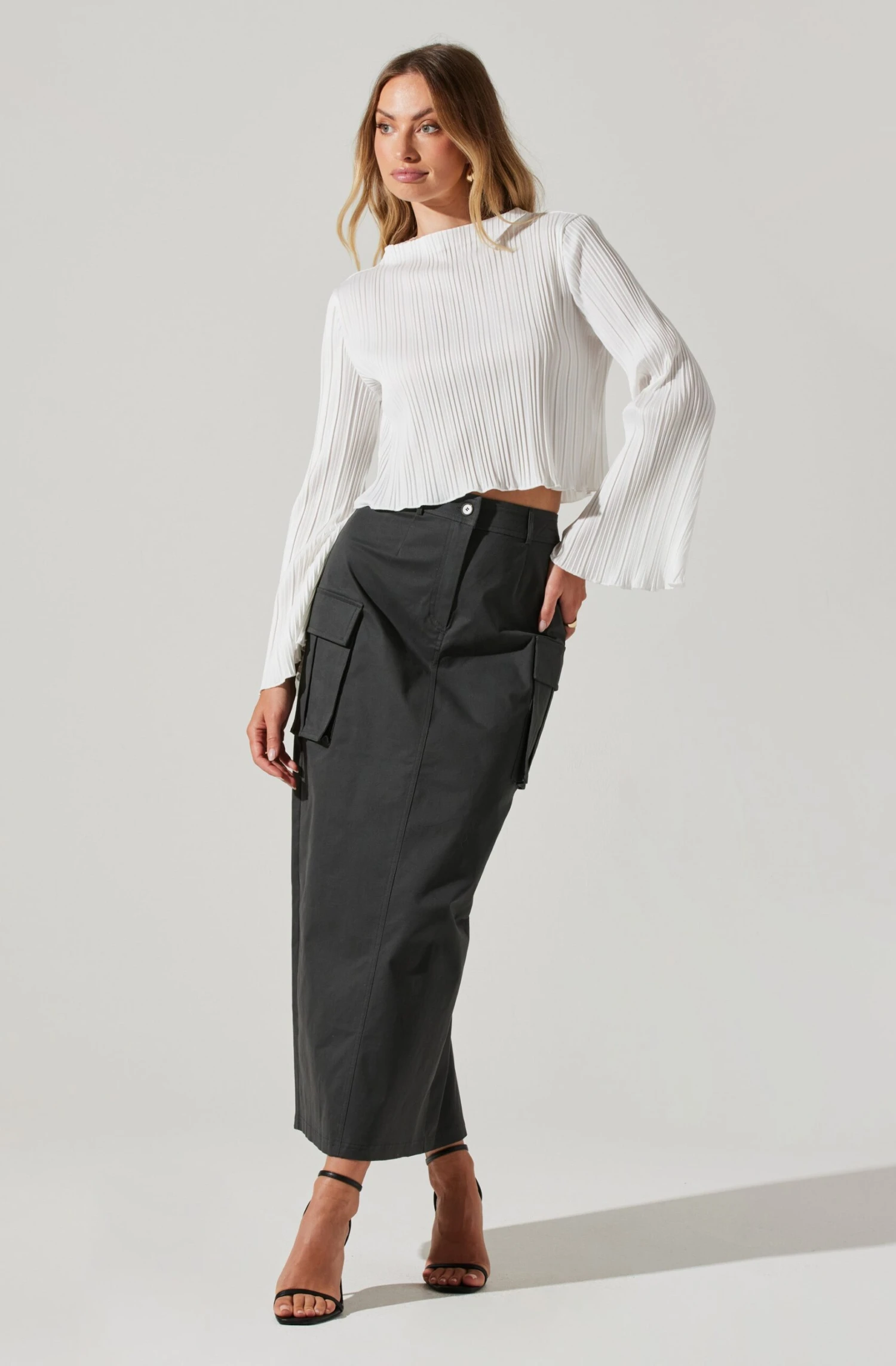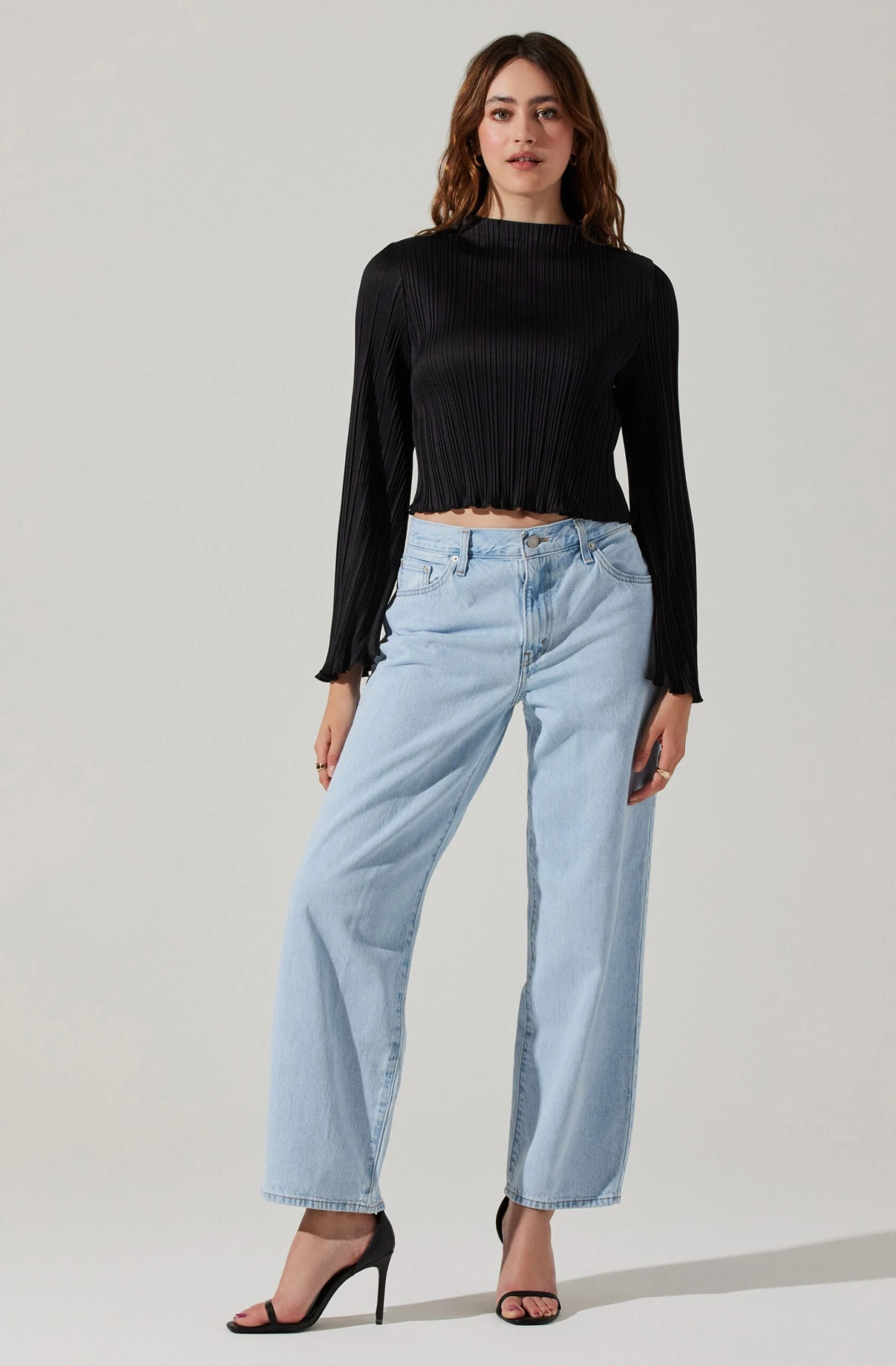 The Cropped Plisse Mock Neck Top boasts unparalleled attention to detail and materials. Its cropped silhouette and pleat texture guarantee a luxurious statement. It blends classic and modern elegance for timeless style.