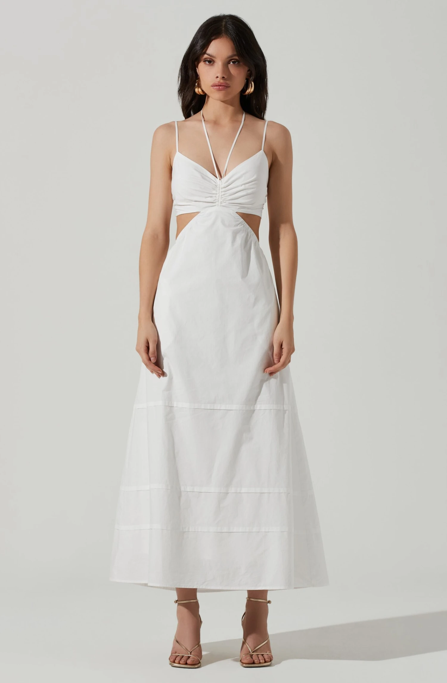 This effortlessly chic dress features a sweetheart neckline with convertible halter straps. Side cutout accents lead to a back cutout feature. Smocked back. Adjustable straps. Fully lined.