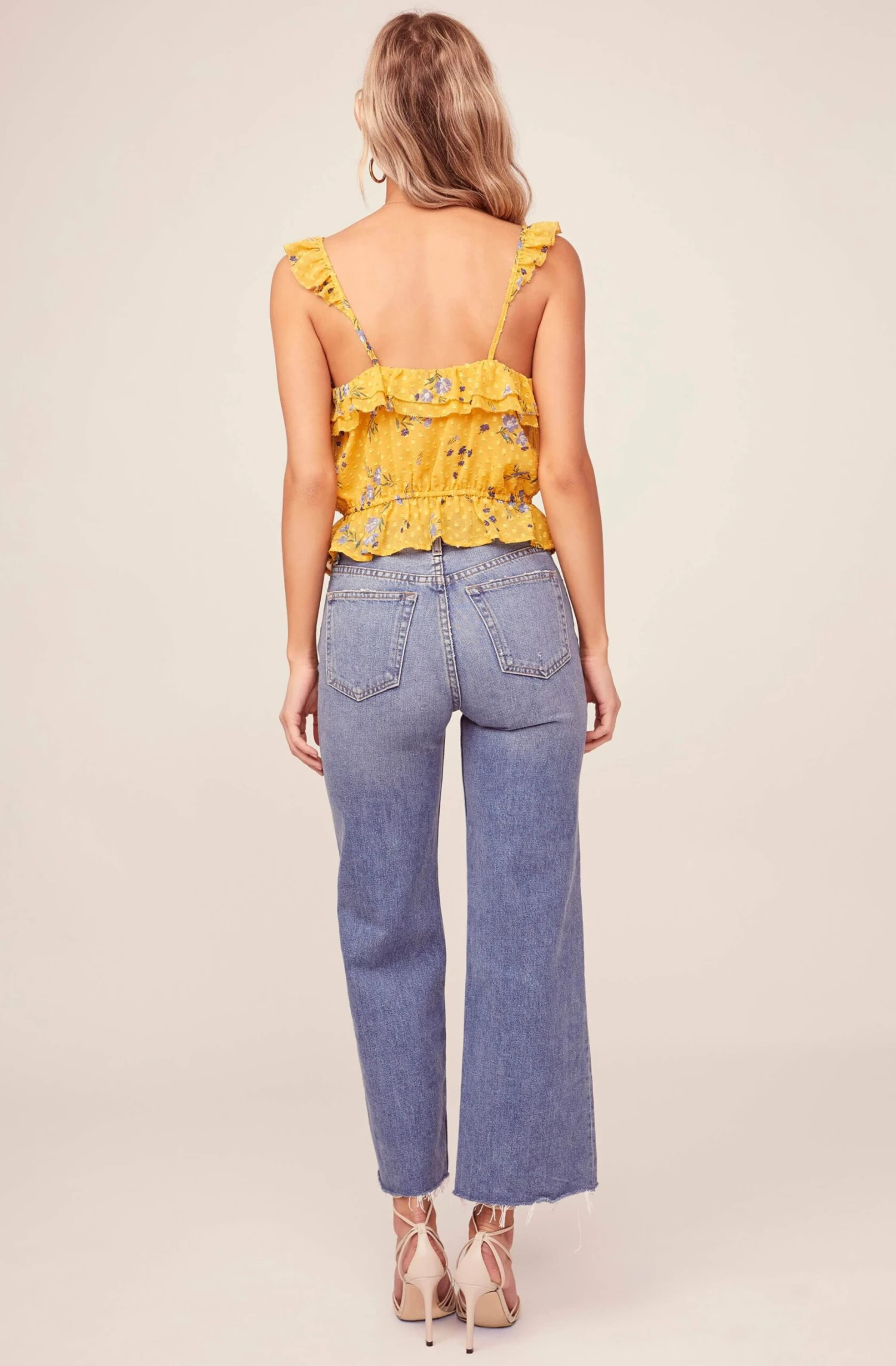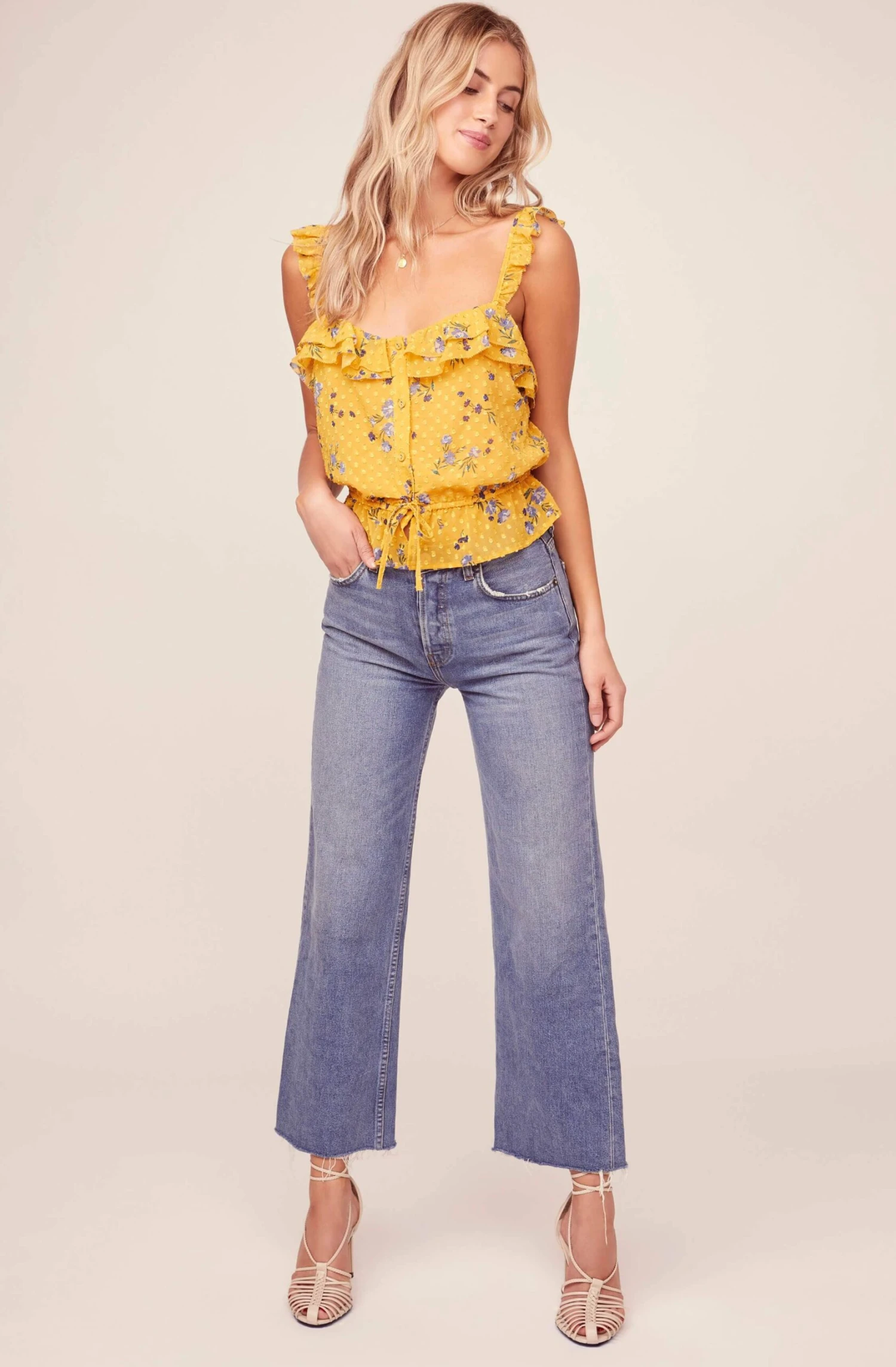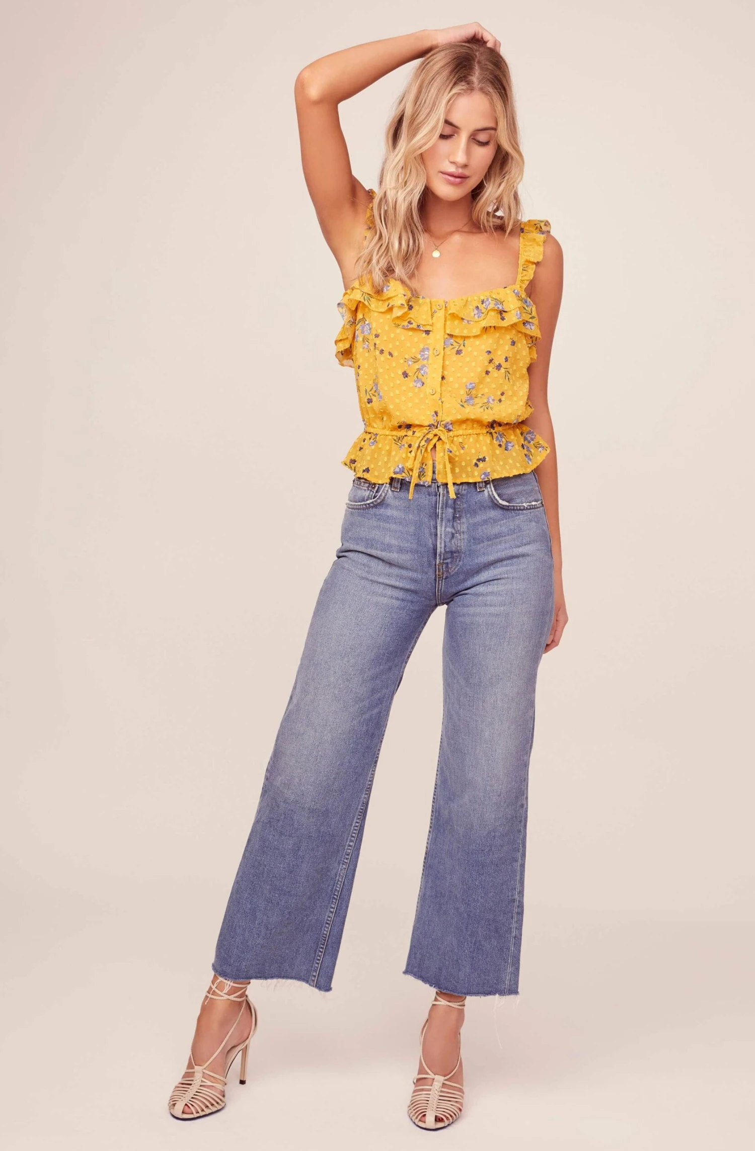 Sunny days call for sunny styles. This cheerful top features a soft square neckline with romantic ruffle trim. Front button placket descends to a flattering cinched waist. Statement polka dot and floral print pattern keeps the good vibes going.