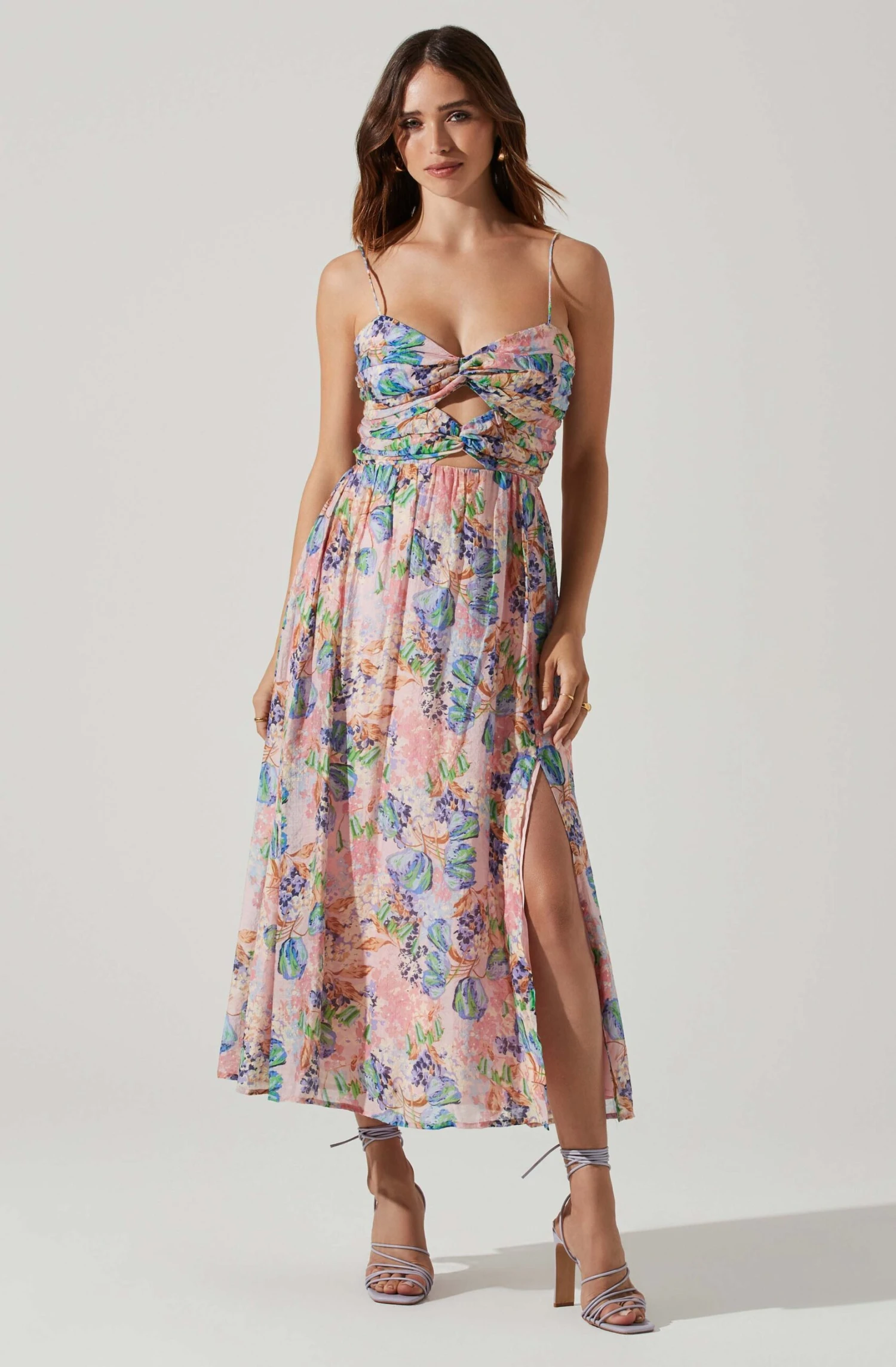 This floral dress features a halter neck that leads to a cinched bust with a statement cutout accent. Flowy midi dress leads to a side slit.