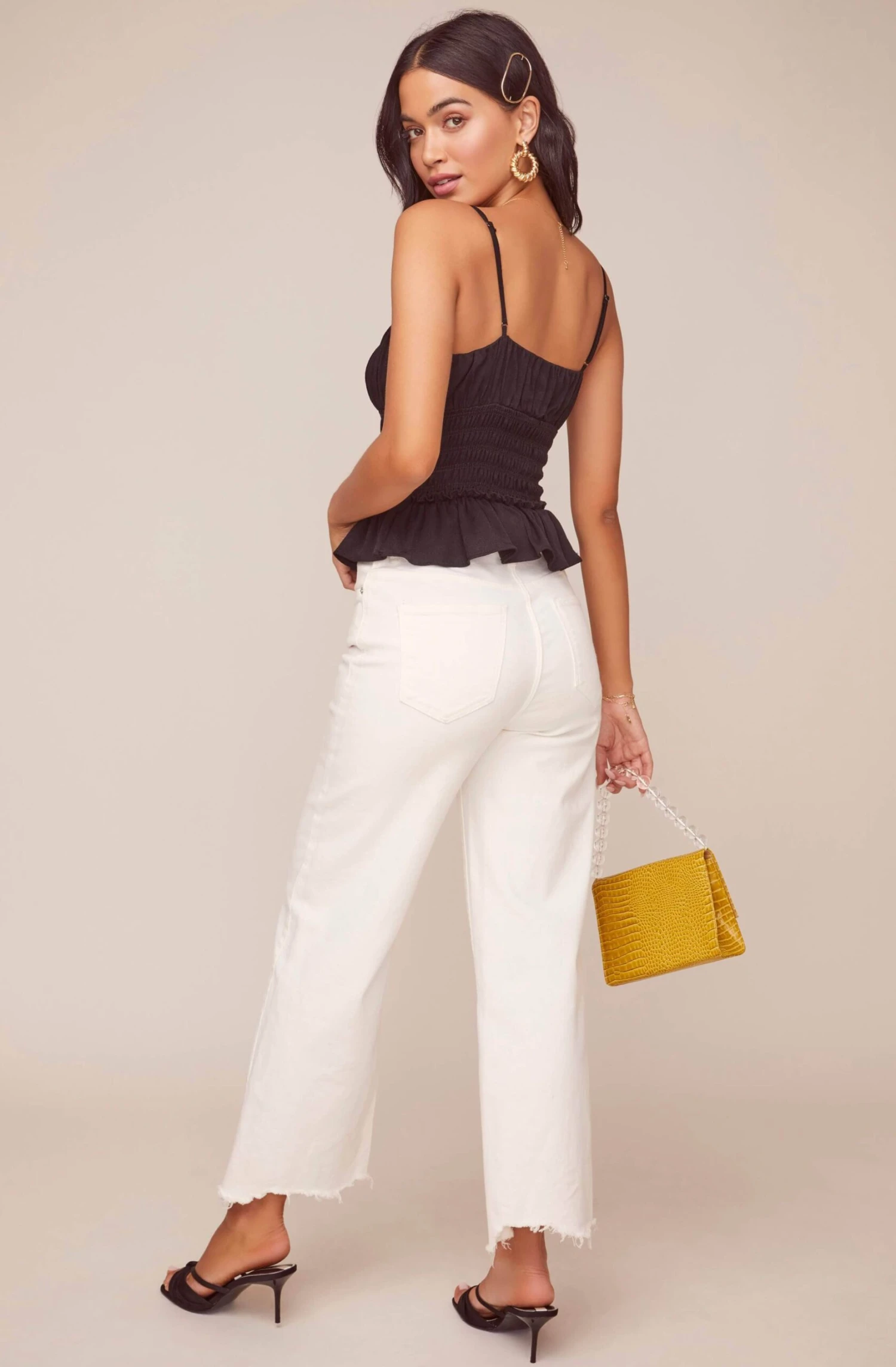 Hello, you! The Fiona Top makes you look good at every angle. With a square neckline and barely-there straps, this style follows with a ruched bust complete with a keyhole accent. Smocked bodice descends to a ruffled hem.