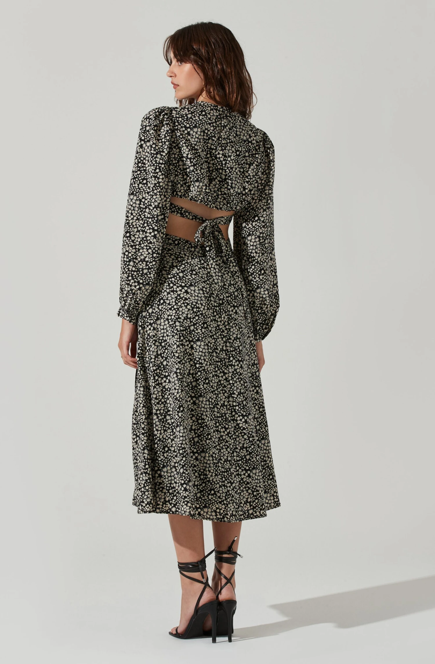 This floral dress features a round neckline that leads to a gathered bust and cutout midriff accents. Tie back accent instantly elevates. Long sleeves. Side slit accent.