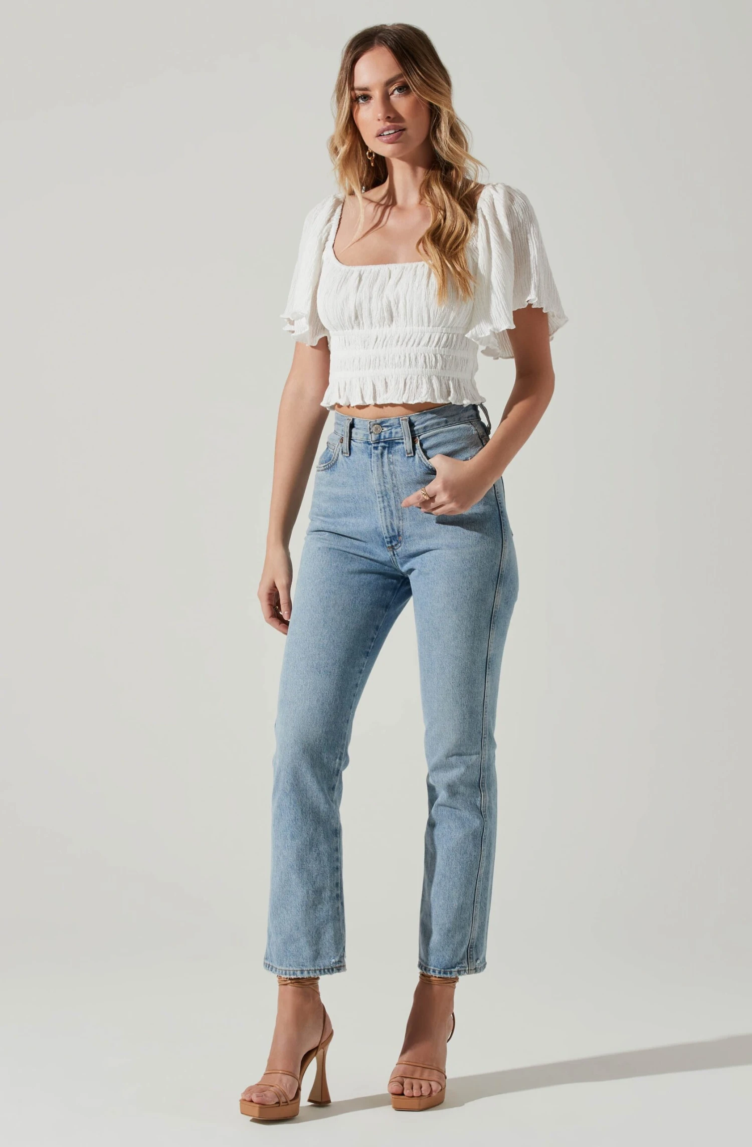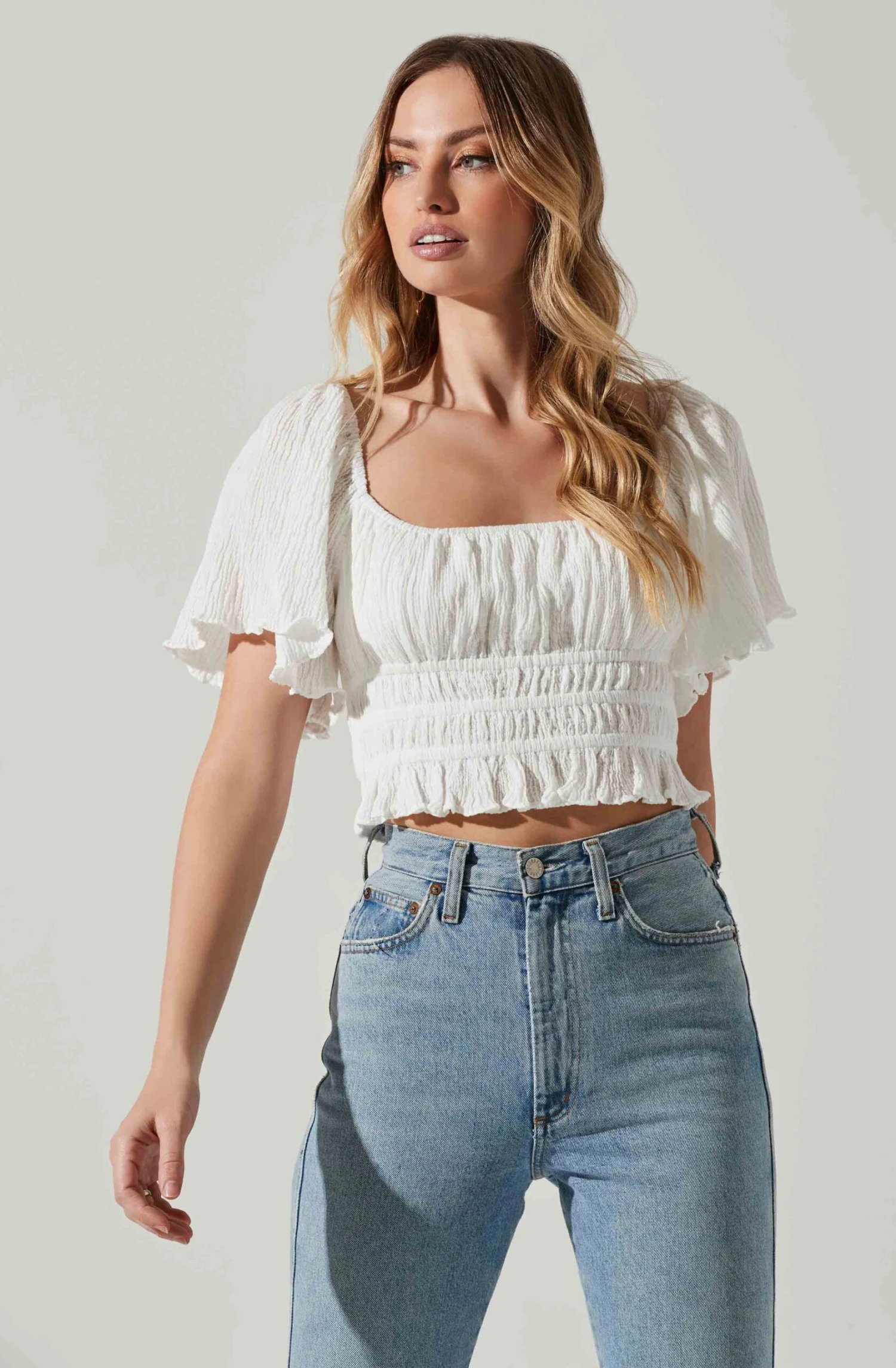This flattering top features a square neckline that leads to a smocked front. Lace back top ties at the hem. Short flutter sleeves.