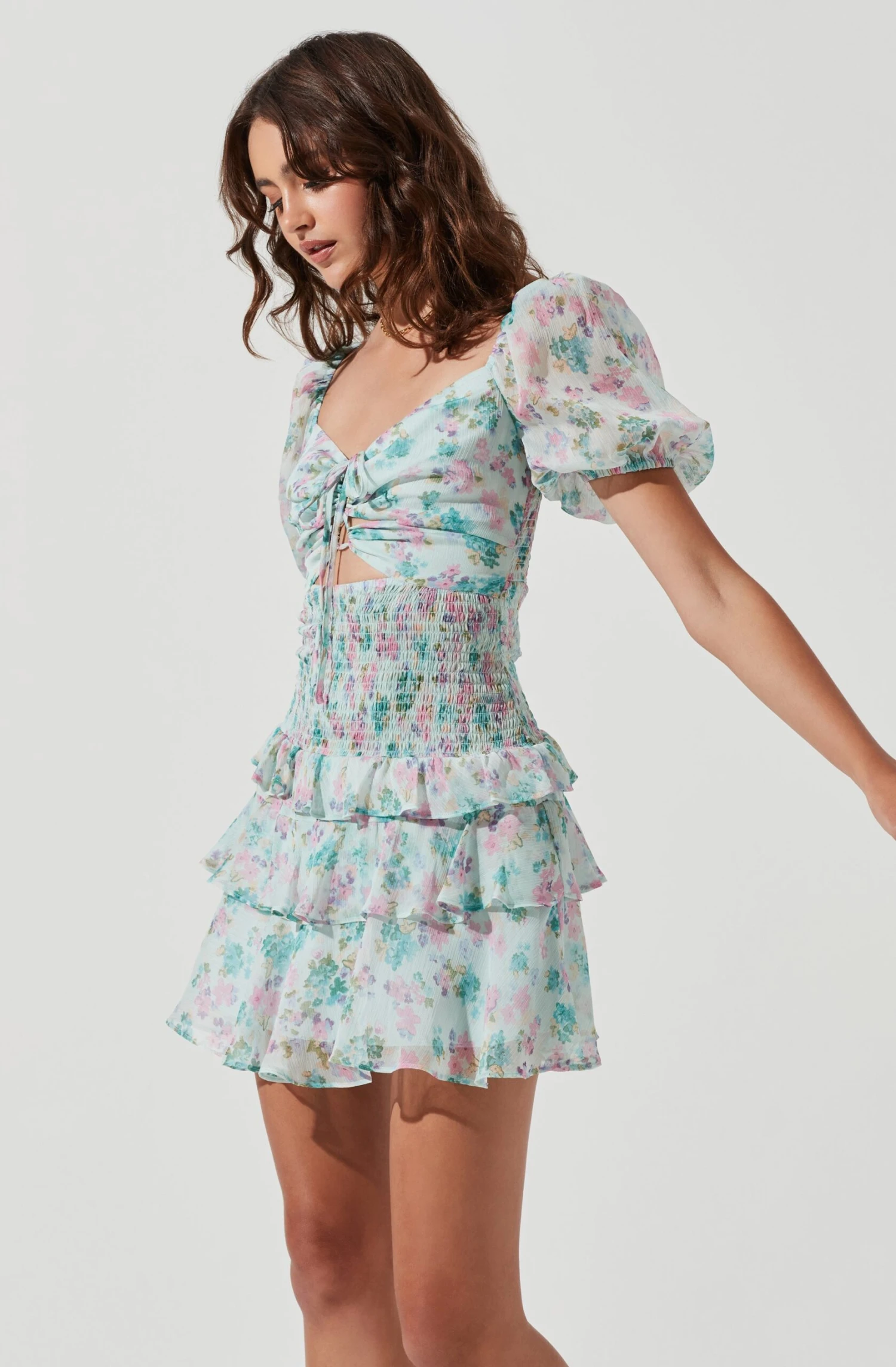 Garland Floral Front Cutout Puff Sleeve Mini Dress