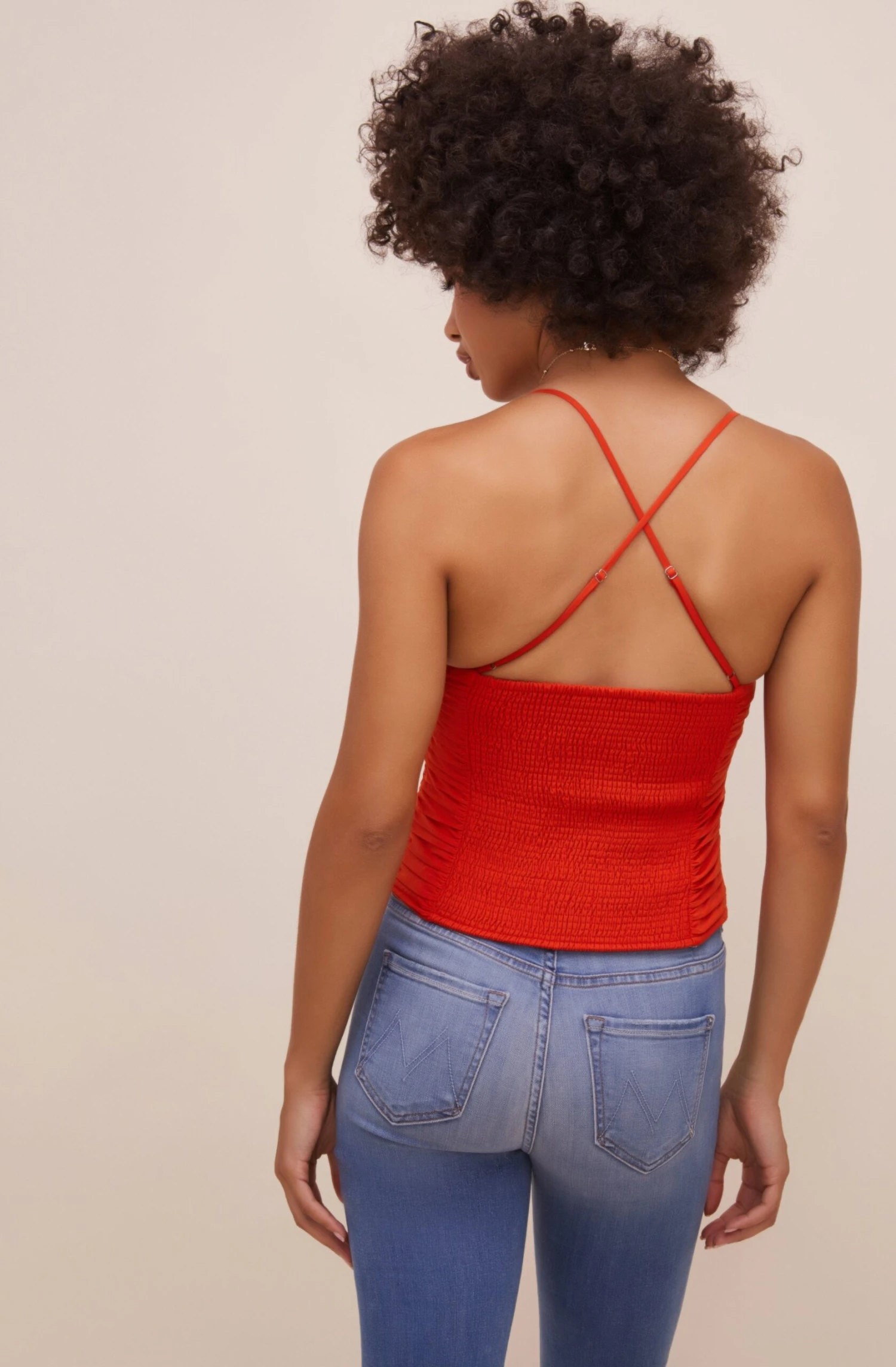 The Helma Top features a V neckline that leads to a pintuck pleated bodice with a criss cross strap back. Smocked back. Adjustable straps.