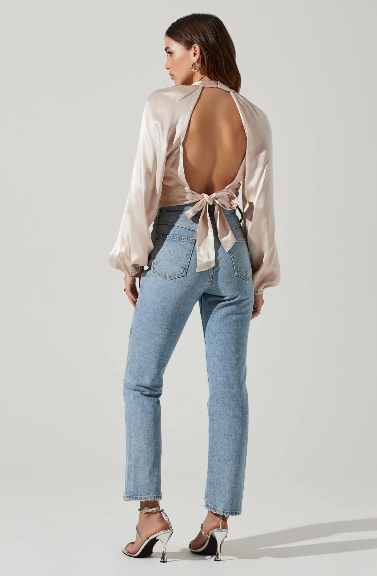 The Idara Top features a high-shine satin finish. Faux halter neckline leads to cutout accents at the front. Cropped hem. Open back features self-tie straps. Long sleeves.