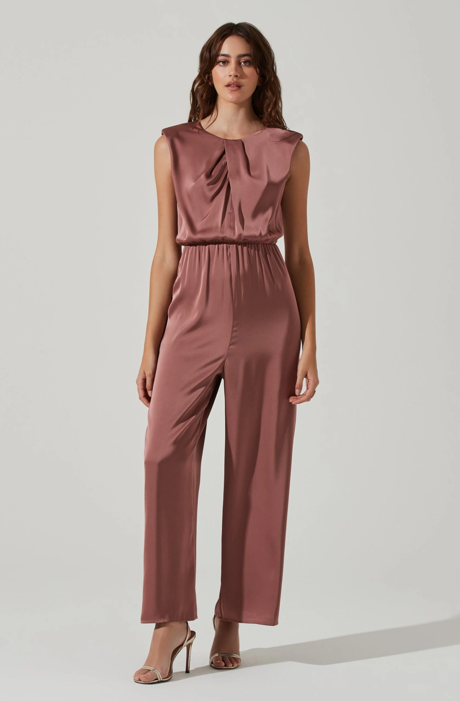 This elegant jumpsuit features a satin finish. Inverted pleats decorate the neckline. Cinched waist. Sleeveless. Keyhole back. Wide leg bottoms. Padded shoulders.