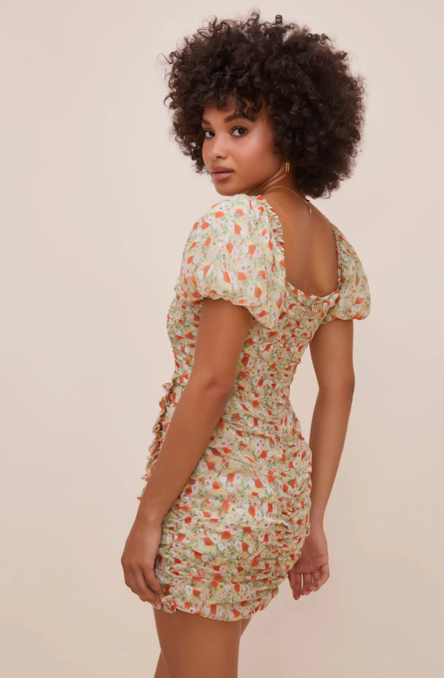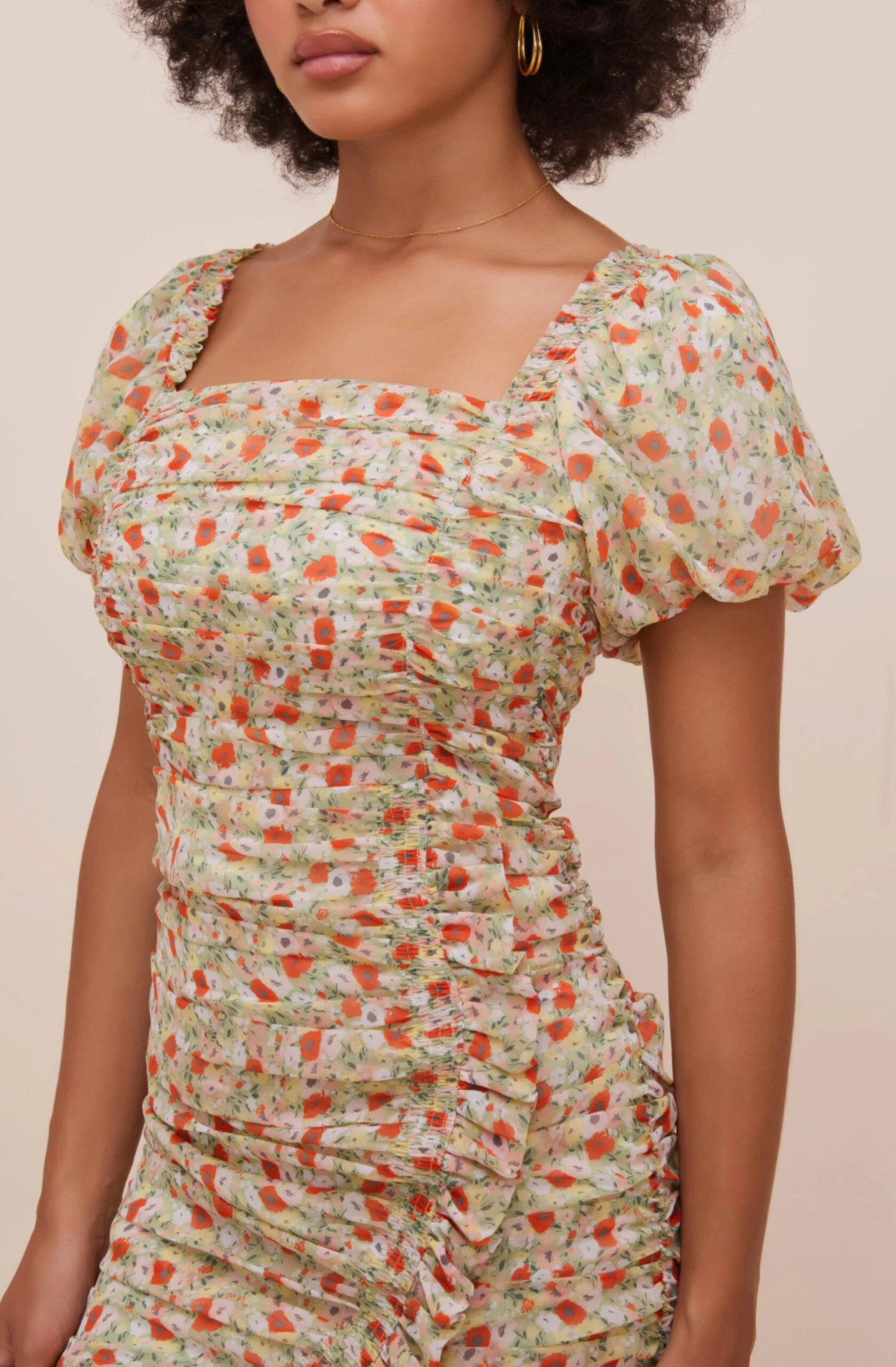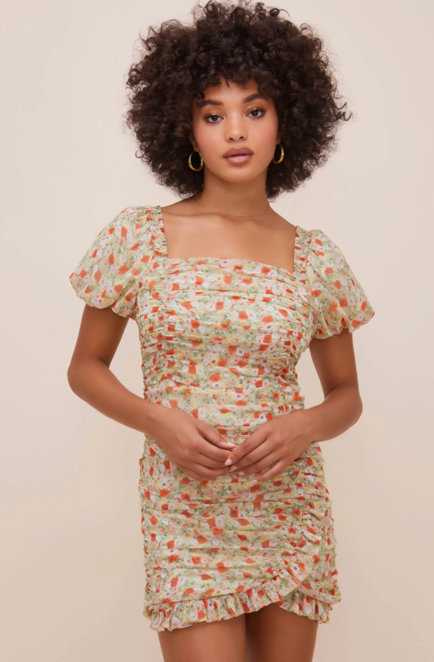 Cheerful prints is what it’s all about. The Julianna Dress features a square neckline that leads to a ruched front and descends to a wrap skirt with ruffle trim and an abbreviated hemline. Short puff sleeves. Hidden back zip closure.