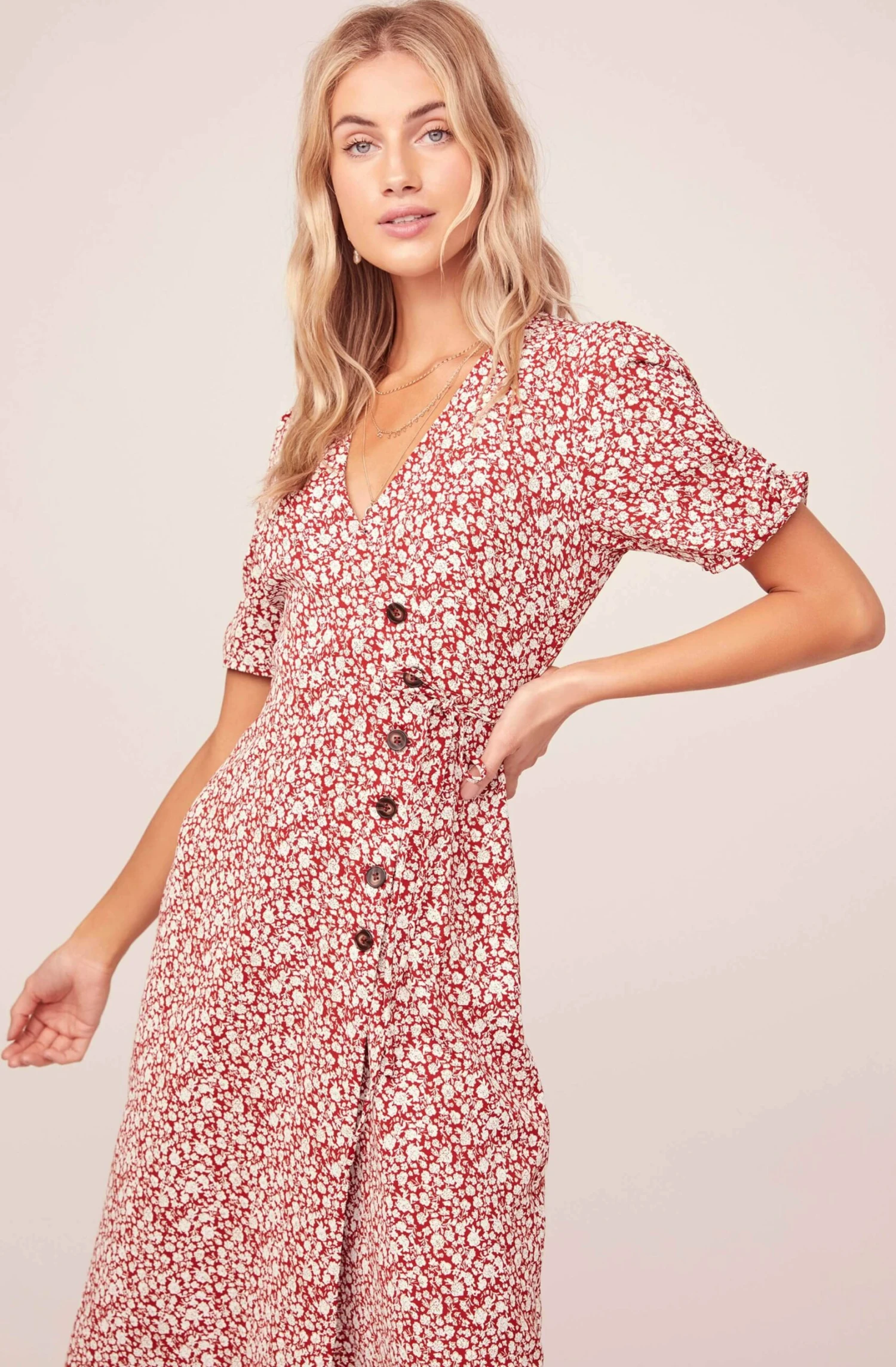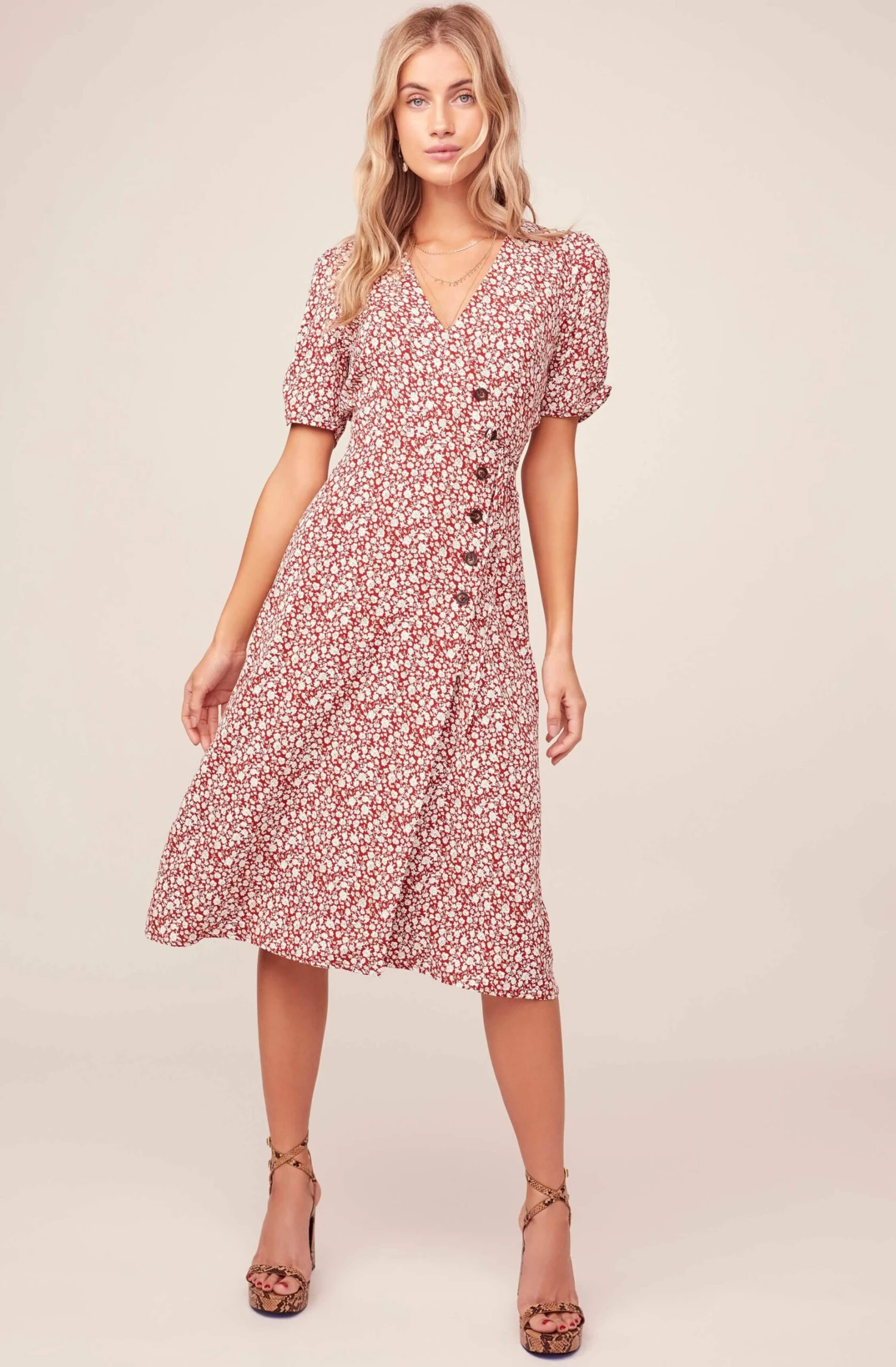 Inspired by chic Parisian style, this midi dress is a summer staple. Combining a ditzy floral print fabrication with delicate details, flattering V neckline and wrap front design accentuate the figure. Asymmetrical mock horn button placket descends to a relaxed maxi skirt. Short ruffle sleeves.