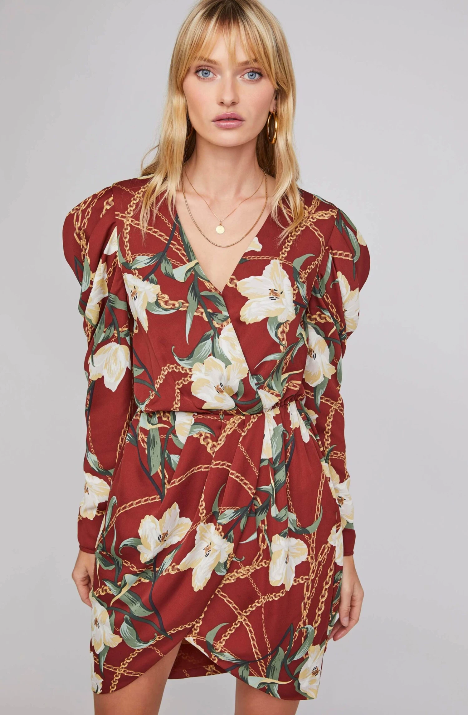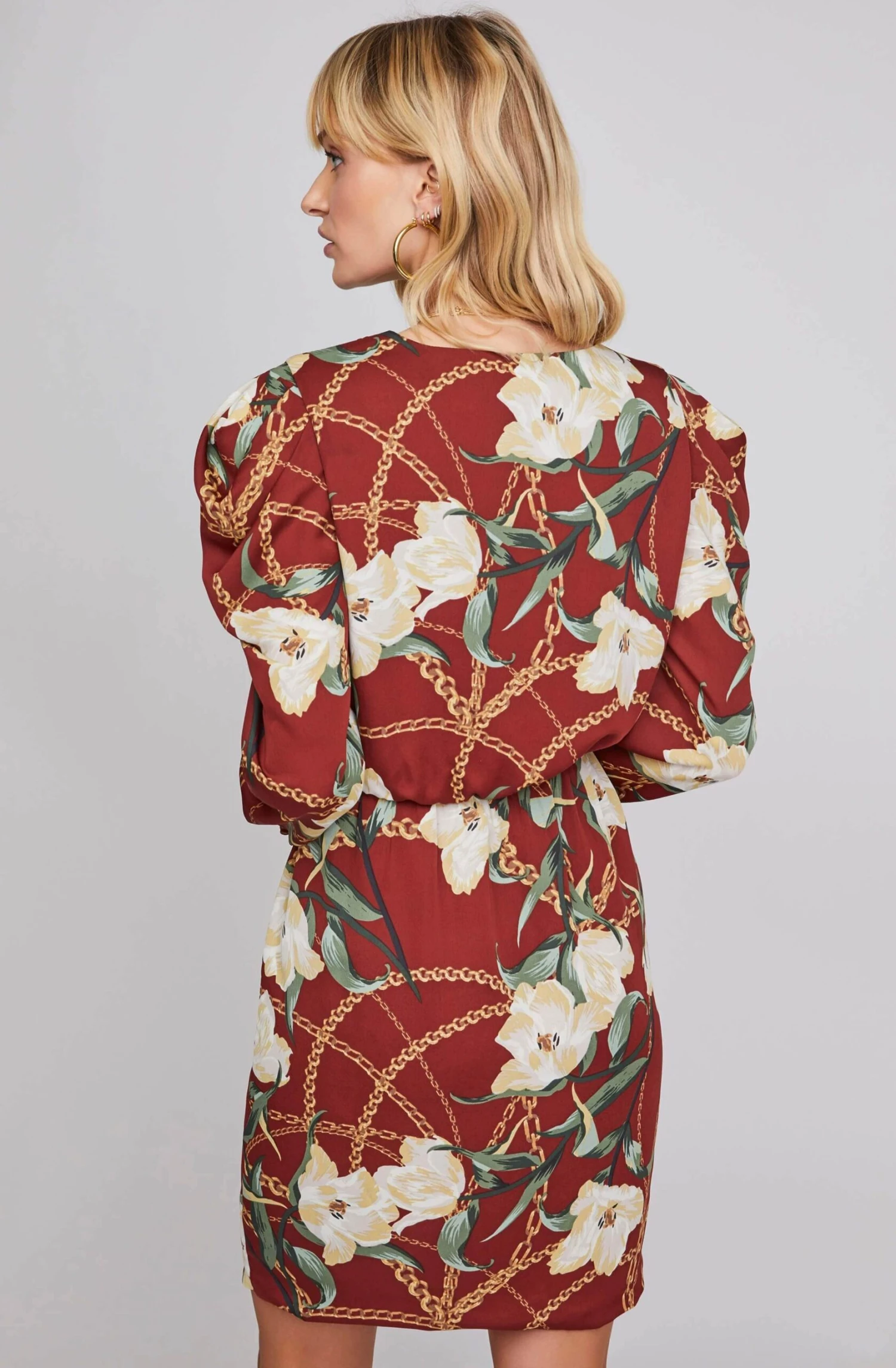Find your inner diva with a look that does all the talking. The London Floral Print Dress features a V-neckline that leads to a wrapped front and cinched waist. Bold shoulders and long, puff sleeves punctuate this look. Complete with mesmerizing floral and chain print.