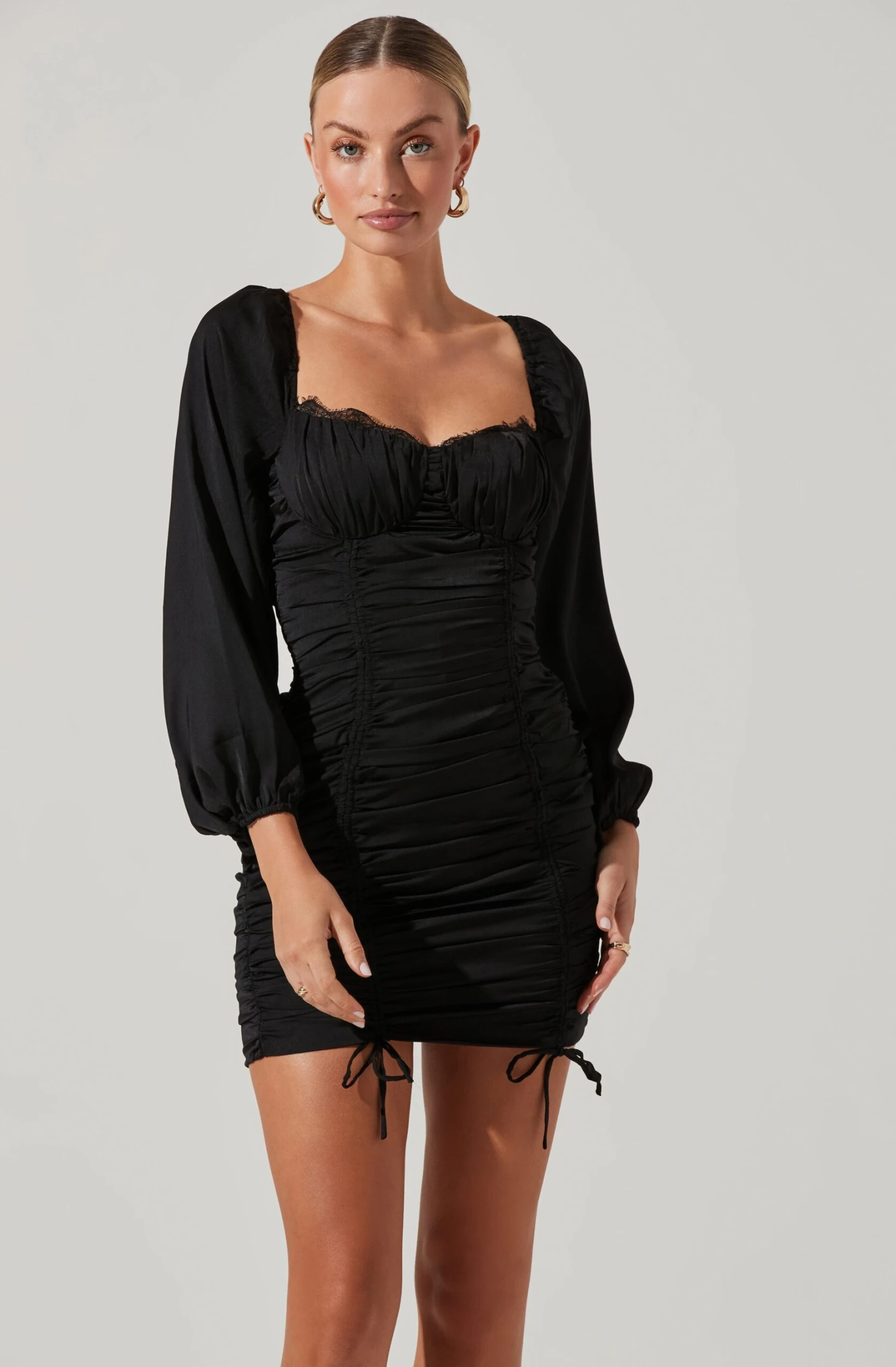 The Mardi Dress is ready to party! It features a sweetheart neckline with lace trim and a cupped bust. Ruched bodice leads to an abbreviated hem and drawstring accents. Long puff sleeves. Self-tie accent. Smocked back.