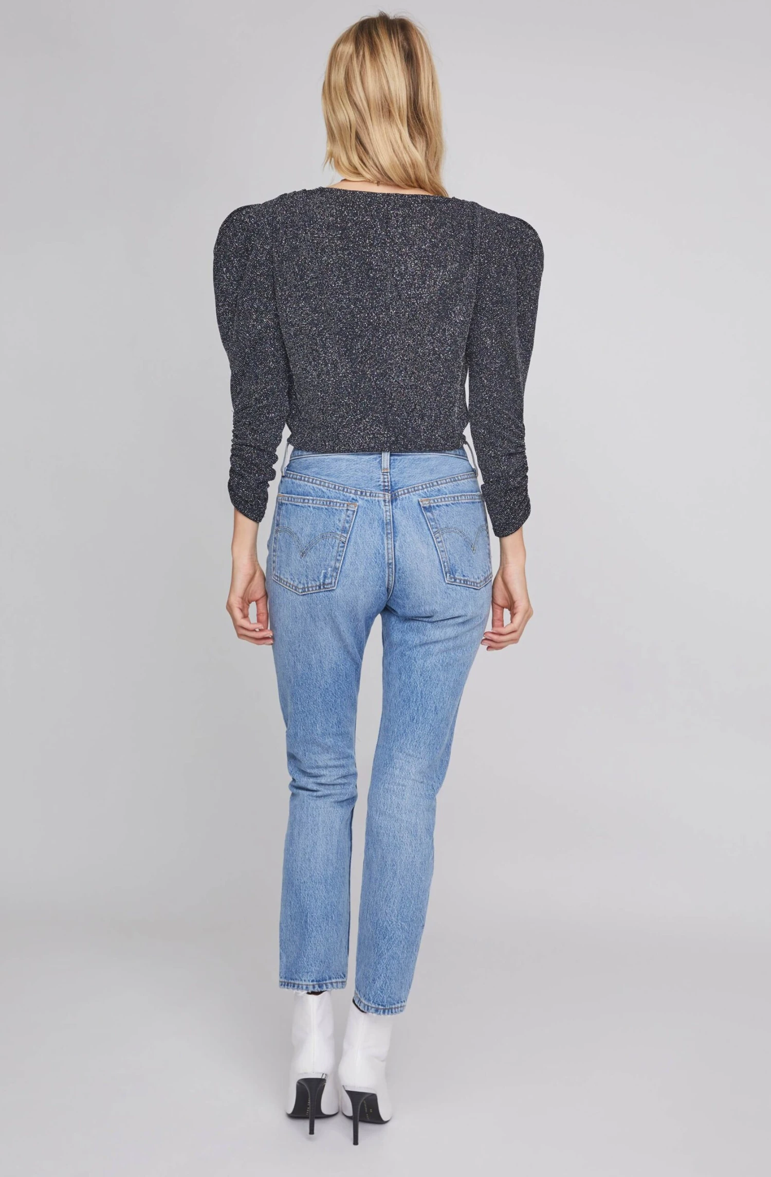 All wrapped up! This sparkling bodysuit features a plunge neckline that descends into a wrap front. Statement puff sleeves with bold shoulders and shirred detailing.