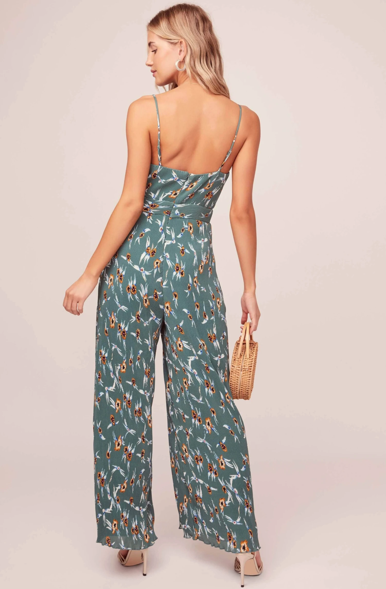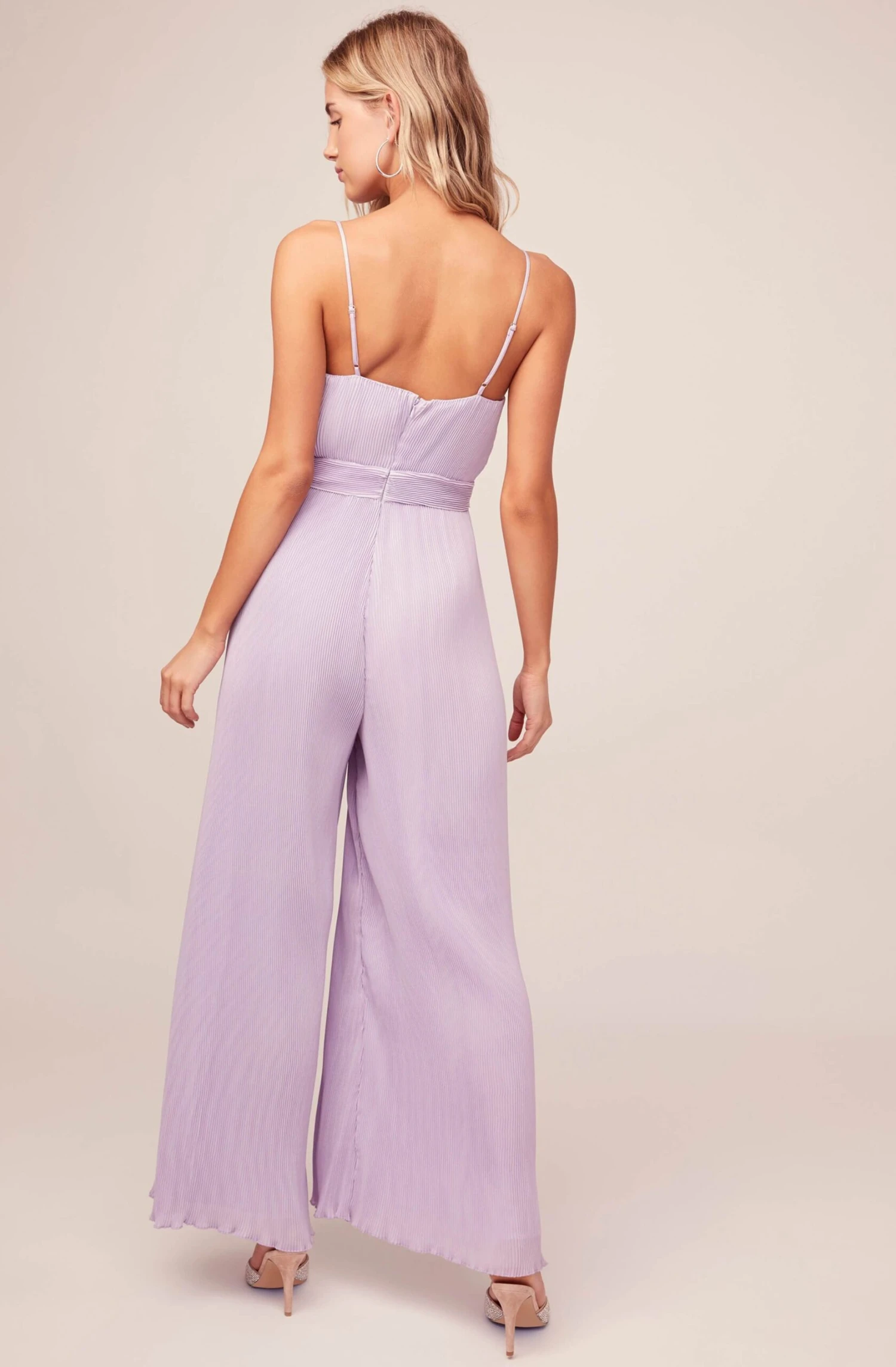 Pretty in plisse! Play up your weekend look with soft hues and pretty prints! V neckline leads to a defined waist for a sexy silhouette. Plisse fabrication and exaggerated wide leg bottoms make this flowy little number the ultimate femme style!