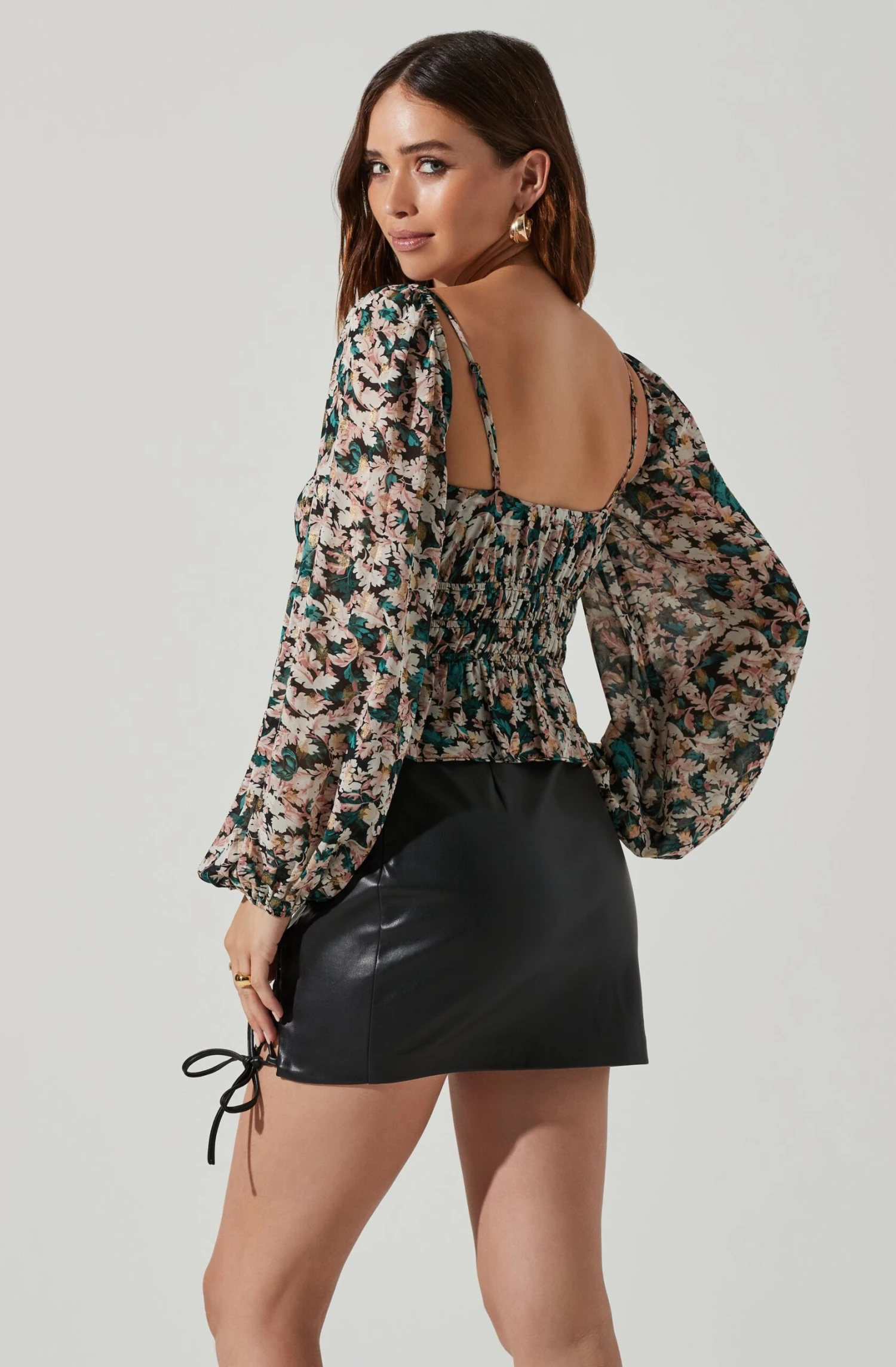 The Prudence Top features a subtle sweetheart neckline that leads to a cupped bust and smocked bodice. Peplum hem. Adjustable shoulder straps and long puff sleeves. Statement floral print throughout.