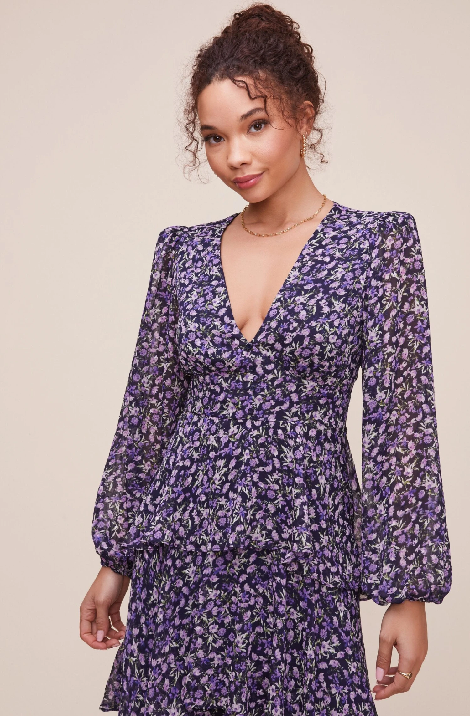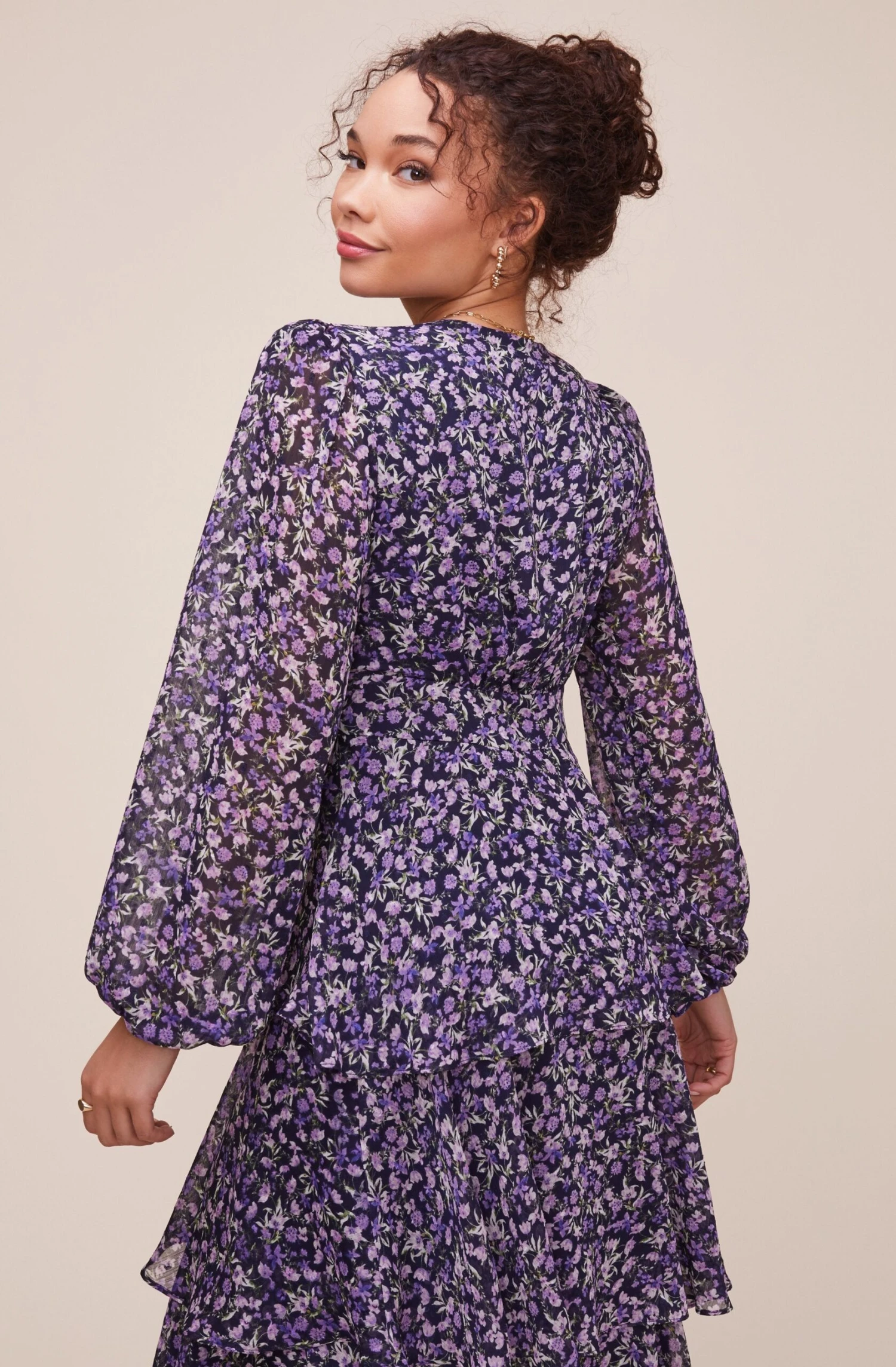 Embody the romance! This darling dress features a sexy V neckline that descends to a figure-flattering bodice and tiered maxi skirt. Long semi-sheer sleeves offer a romantic puff construction.