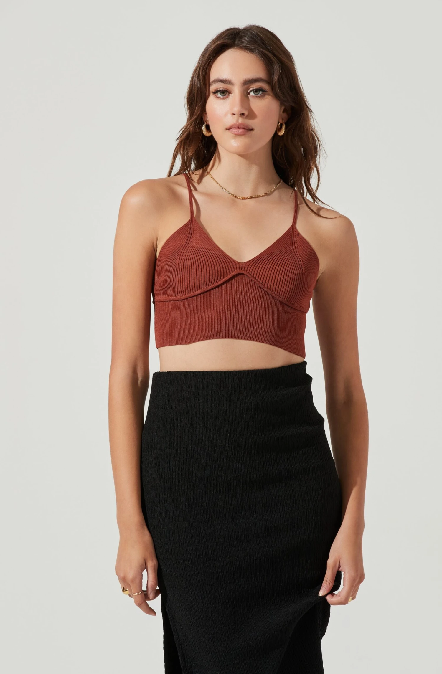 This bralette features a ribbed knit design with a seamed bust and adjustable straps. Cropped hem. Slight stretch.