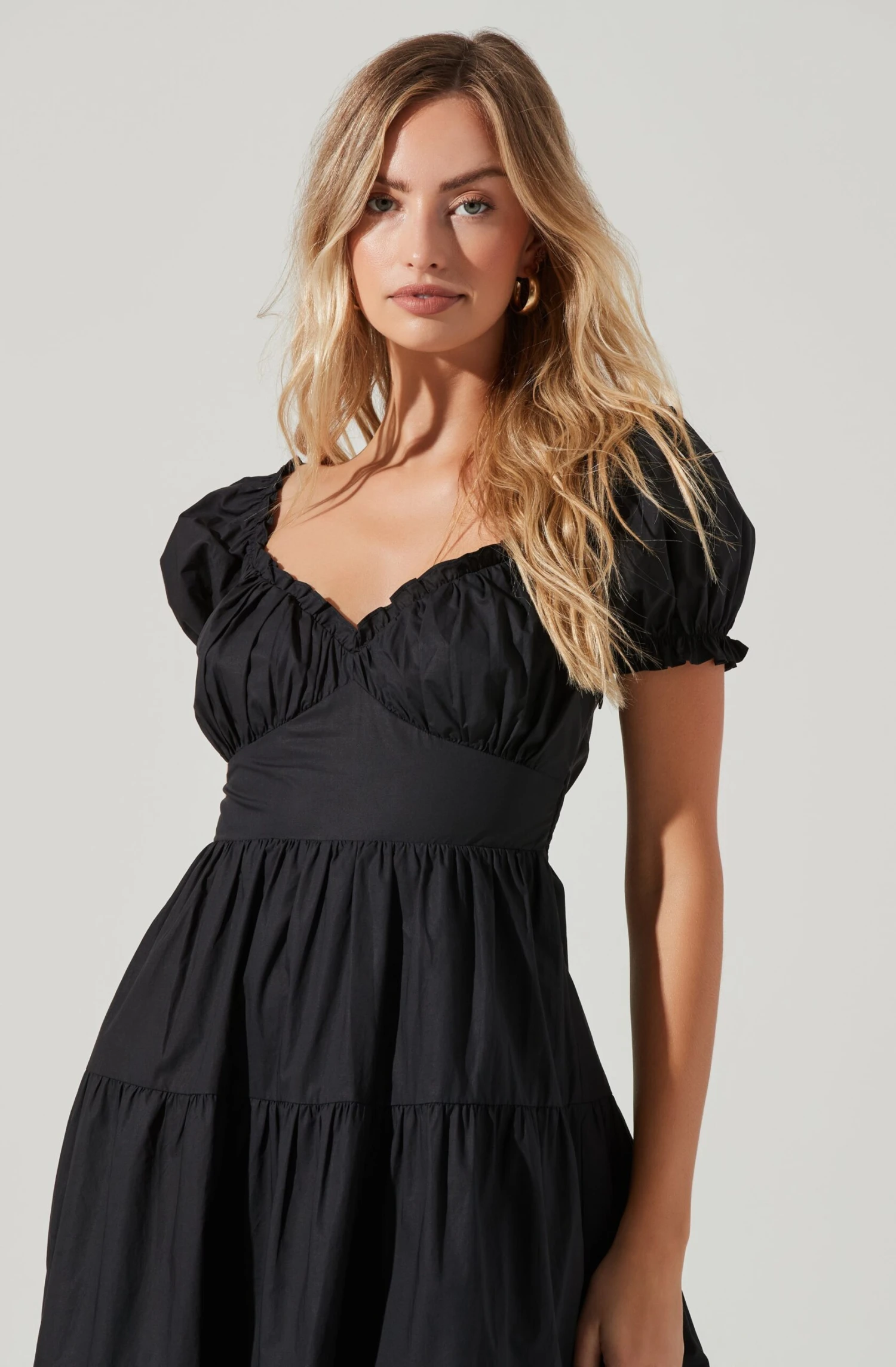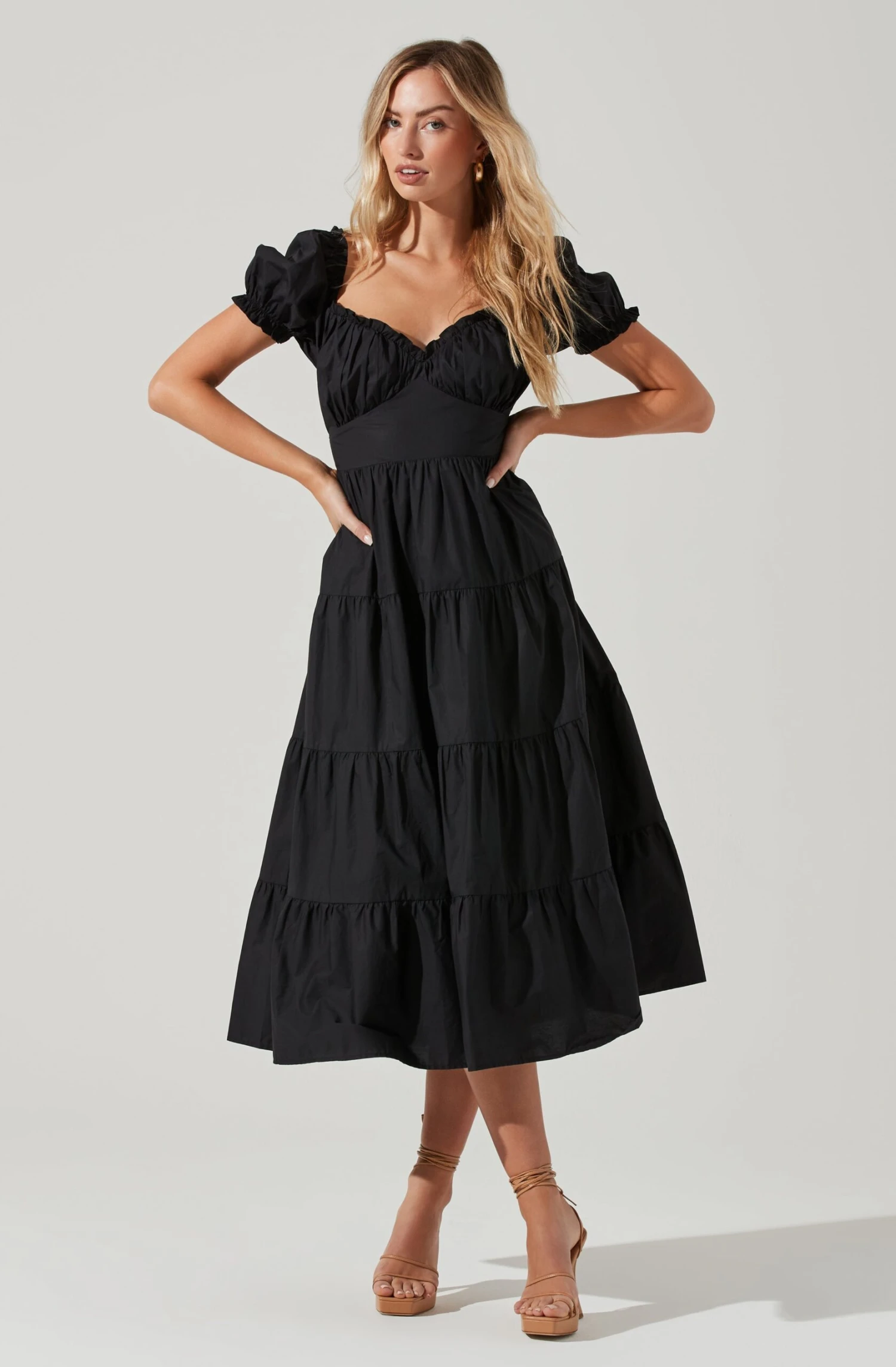 This romantic dress features a sweetheart neckline that leads to a cinched bust and defined waist. Tiered skirt. Short puff sleeves. Smocked back.