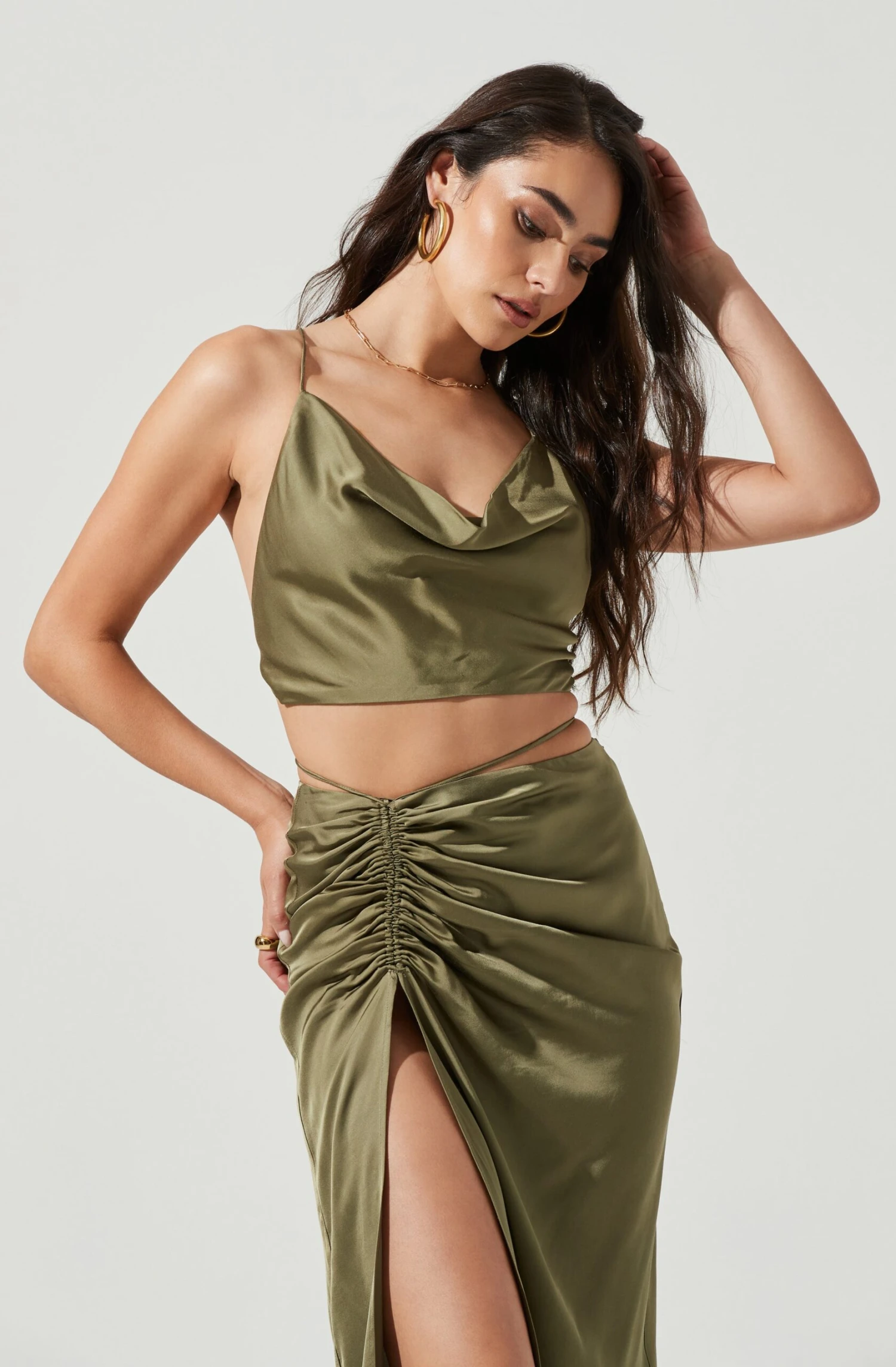 The South Beach Top is the perfect piece for a fun night out! It features a cowl neckline supported by adjustable straps that cross at the back. Cropped hem.