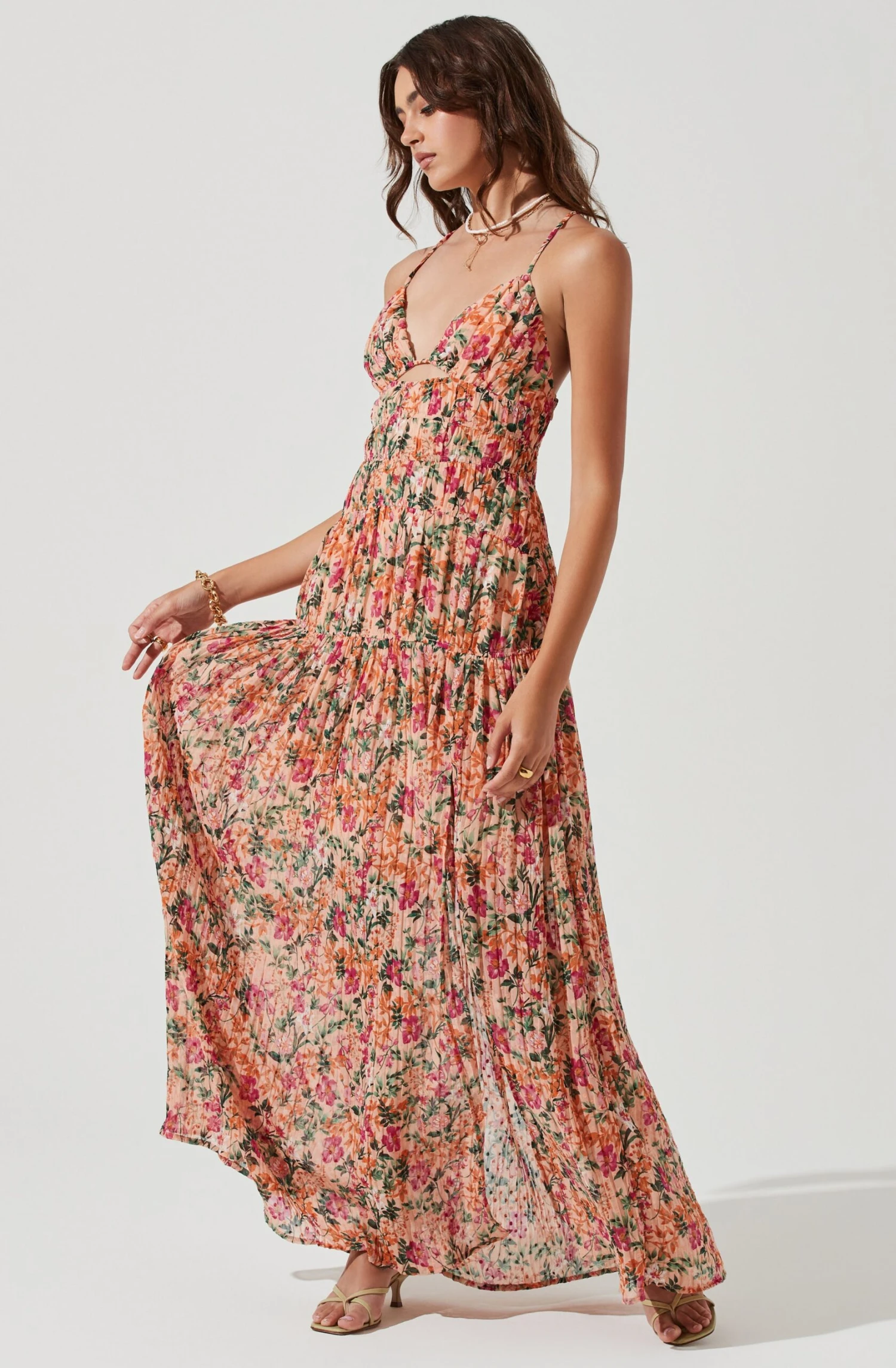 This statement occasion dress features a plunging neckline that leads to a front cutout accent at the bust. Flattering pleating throughout. Side slit accent. Open back with adjustable cross straps.