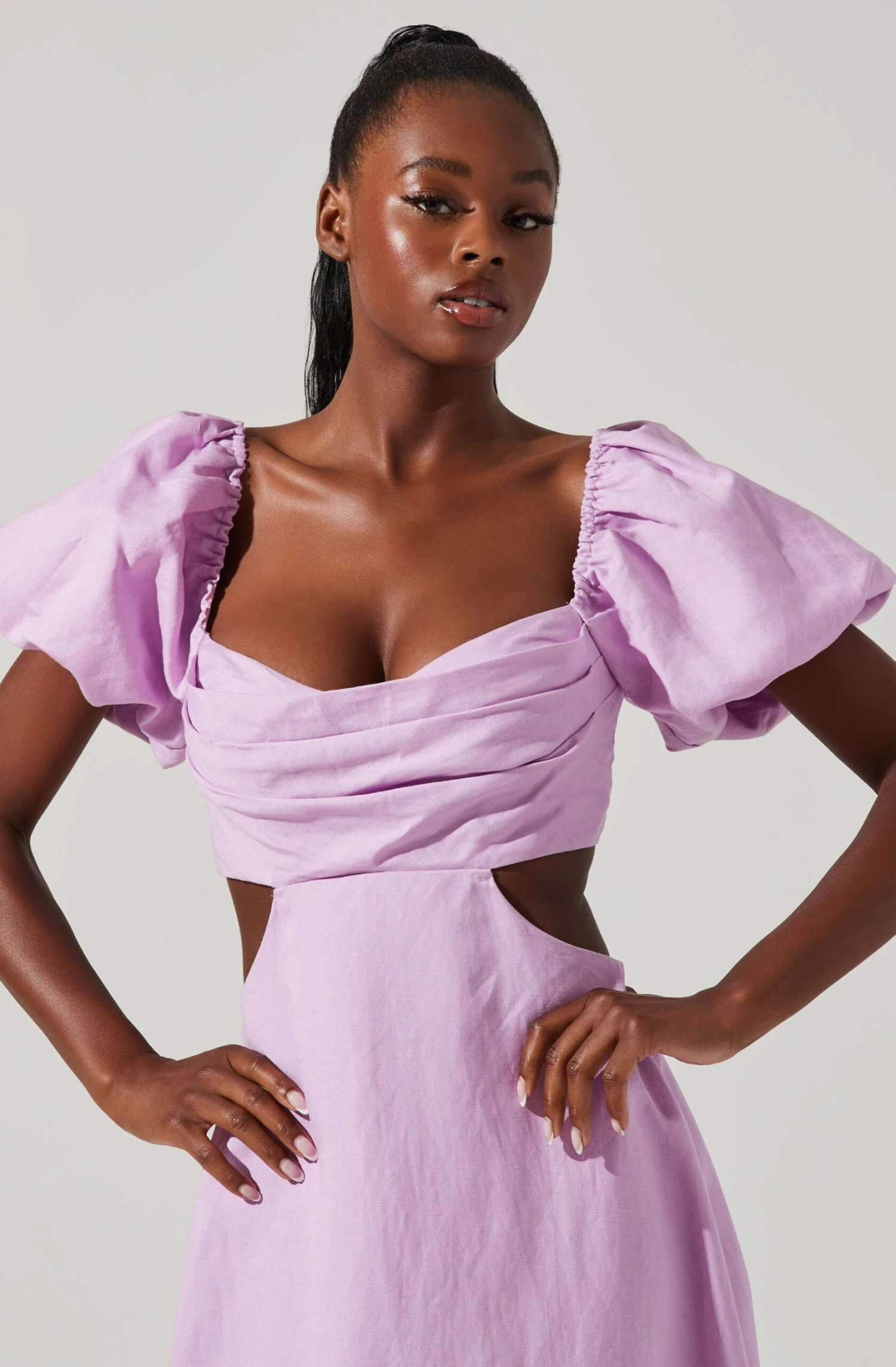 The Winley Dress has a sweetheart neckline that leads to side cutout accents and open back. Short puff sleeves. Midi-length skirt. Supportive, elastic back strap. Concealed back zip closure.