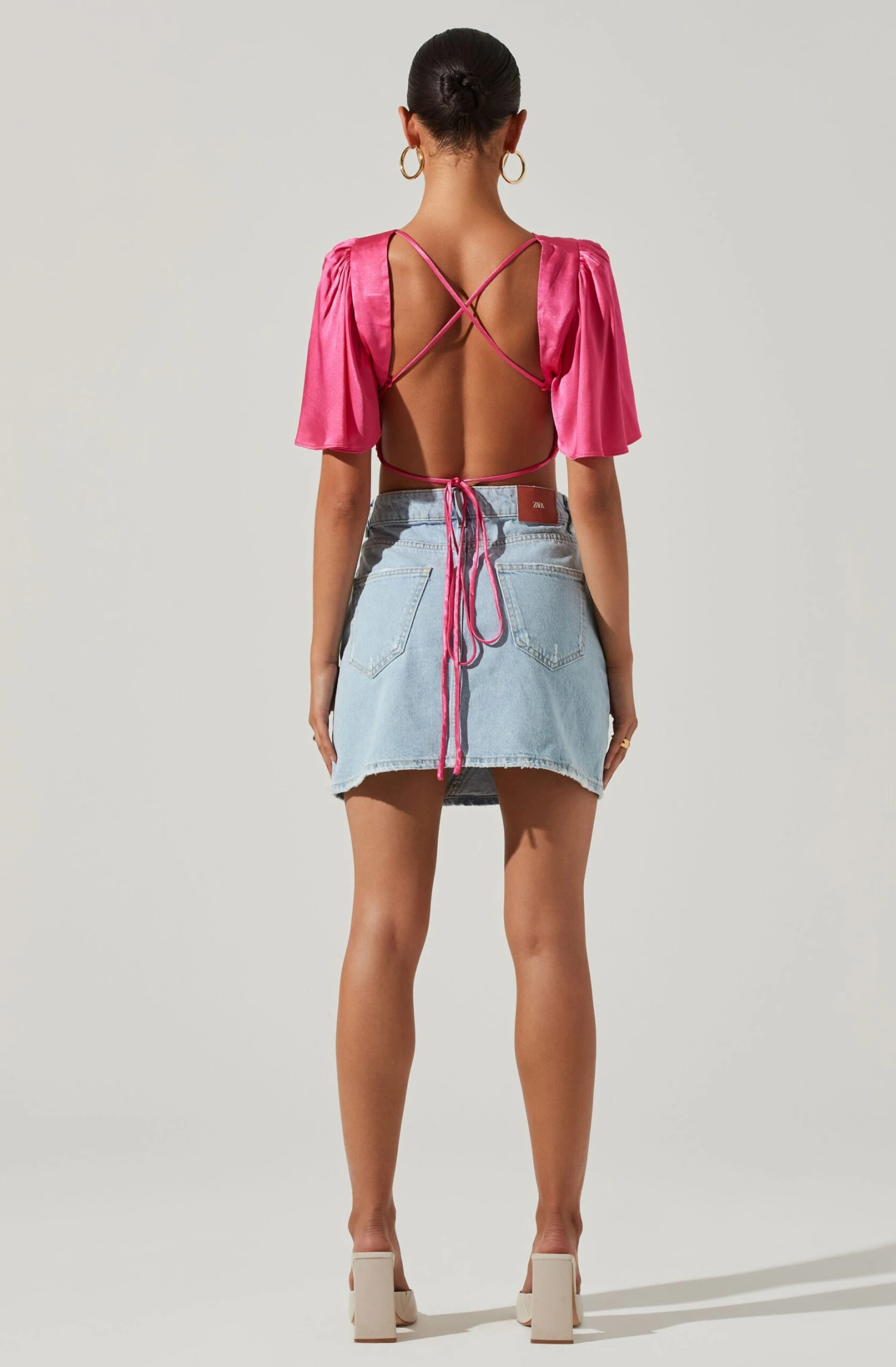 The Zita Top features a satin finish. Cropped hem features short flutter sleeves. Open back has cross strap accents.